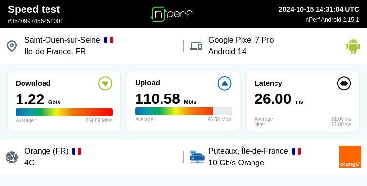 ↓1218611 kb/s ↑110579 kb/s, ⇄ 26 ms / mobile:Orange Mobile / #Pixel7Pro / #nPerf v2.15.1 / avec la 4G d'Orange