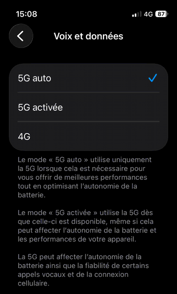 Les experts du forum me corrigeront si besoin, mais il me semble que cette limitation 5G/4G sur iOS est directement imposée par l'opérateur via son fichier bundle. Est-ce que d'autres opérateurs ont une politique différente sur ce point ?