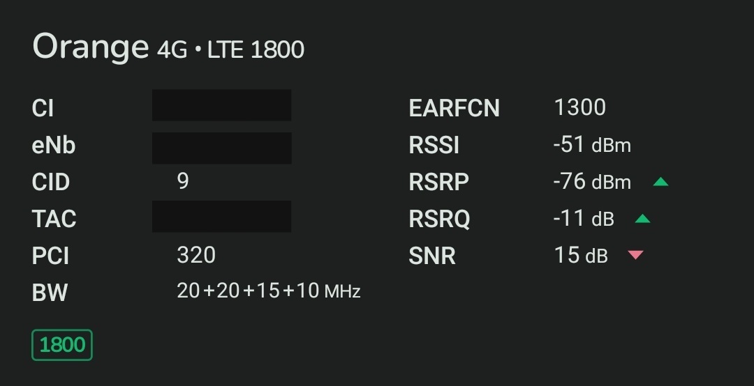 Sur l'image ci-dessous, on voit que mon smartphone (SIM Orange) est connecté en 4G à la bande des 1800 Mhz.