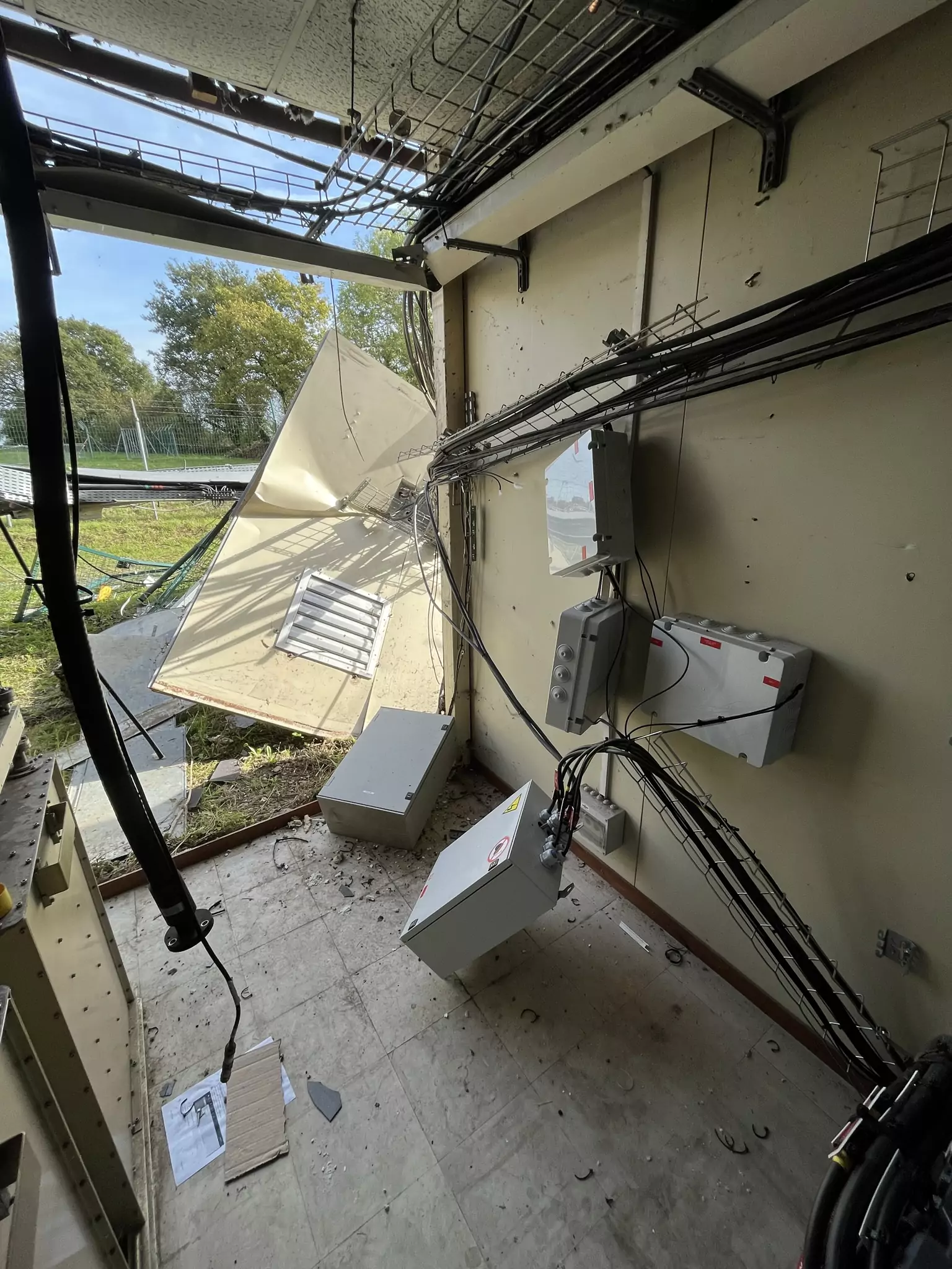 Avec les photos, c'est plus parlant. Les modules dans le local technique ont été arrachés par la chute du pylône. C'est un pylône TDF qui diffuse aussi la radio semble-t-il :
