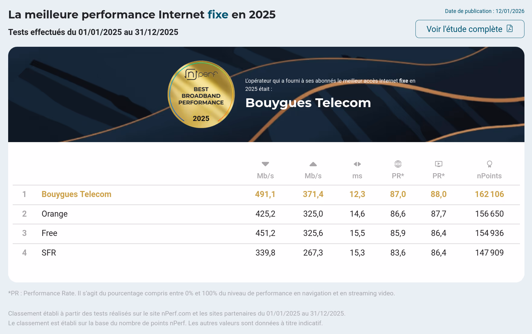 L'année 2025 a été marquée par une concurrence intense et le déploiement massif de box équipées du Wi-Fi 7, accompagnées d'offres à très haut débit toujours plus attractives. Bouygues Telecom a consolidé sa position de leader. Les quatre opérateurs français ont poursuivi leurs investissements, se traduisant par des gains notables : +25% sur le débit descendant, +26%sur le débit montant, et une réduction de 9% de la latence.