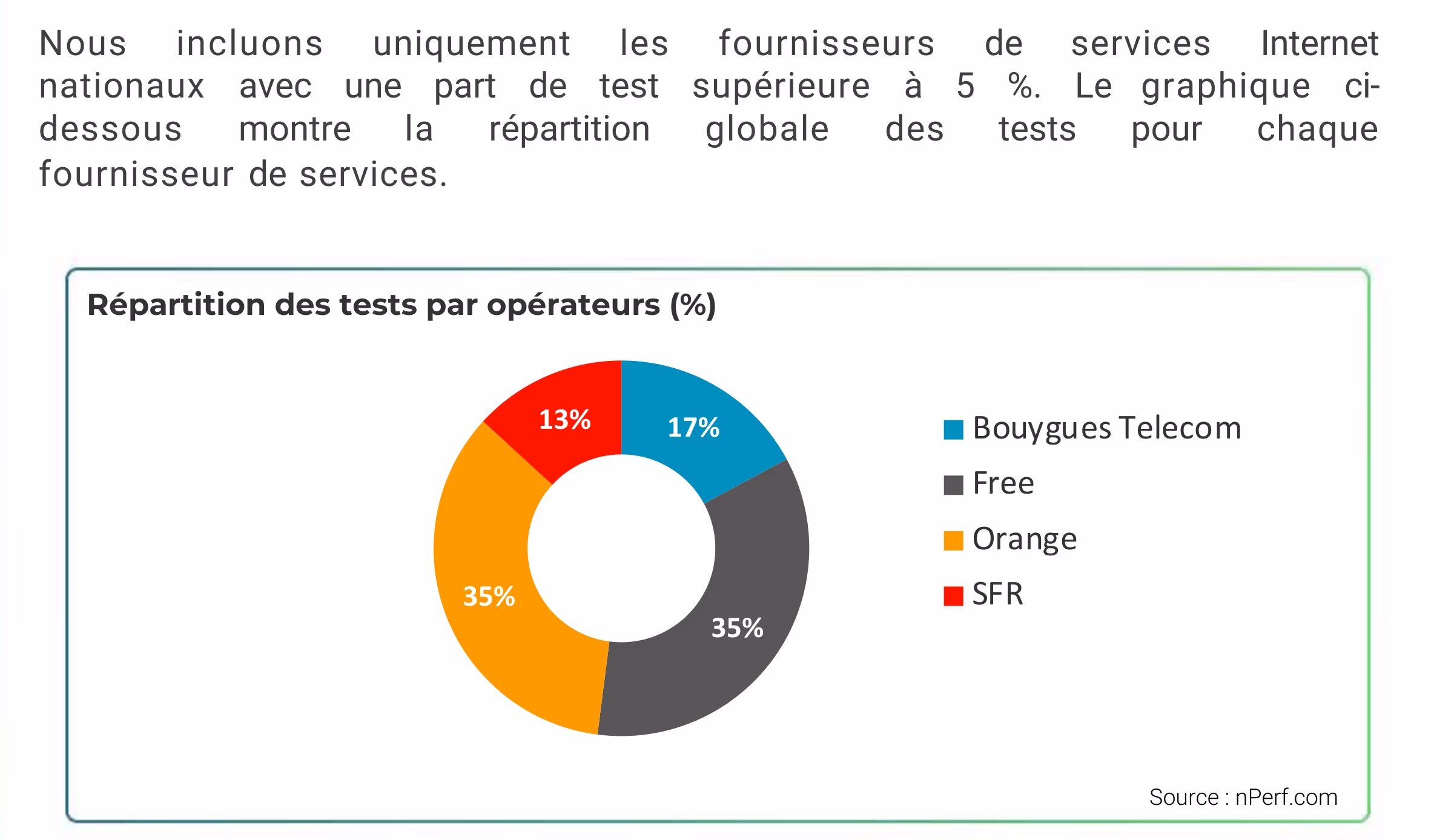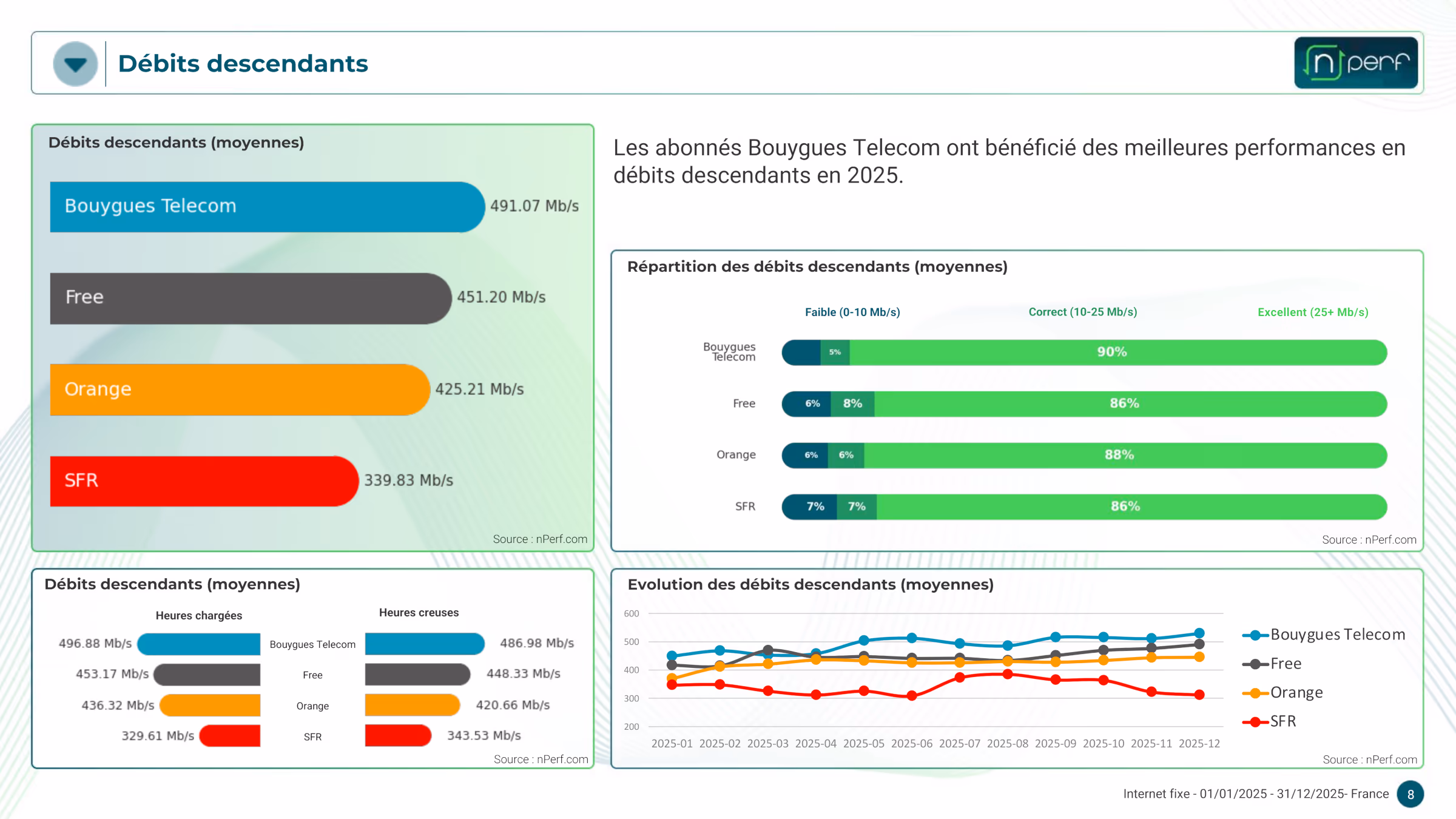 nPerf note une amélioration générale de 25% des débits moyens, ce qui se comprend, avec la part de plus en plus importante des abonnements FTTH, et du débit de ces offres (on a de plus en plus de 8 Gb/s). Et aussi parce que commercialement, les offres avec des débits bridés sont de moins en moins nombreuses (ou leur débit augmenté à 1 Gb/s). Avant, seul Free ne bridait pas ses offres, offrant en FTTH au minimum le Gb/s. De ce fait, Free a perdu son leadership sur les débits fixes.