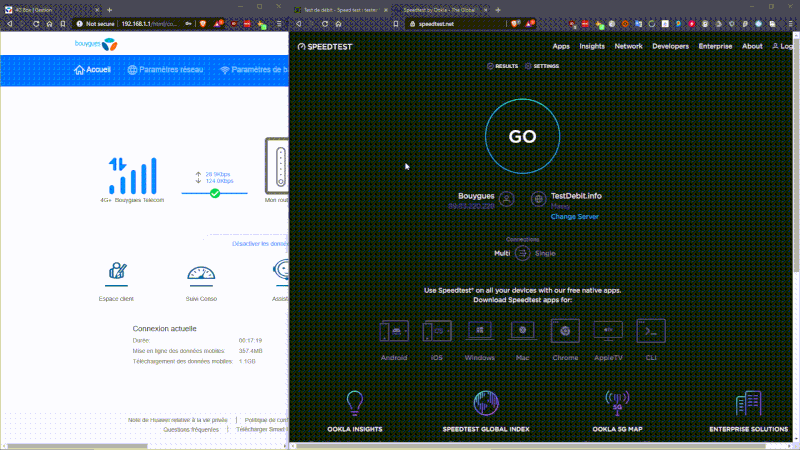 J'ai ressorti la box de Bouygues pour vous montrez le résultat mais en réalité je dispose d'un routeur 4G+ beaucoup plus performant qui est le Netgear MR2100 CAT20 2 Gbps 5CA en support: