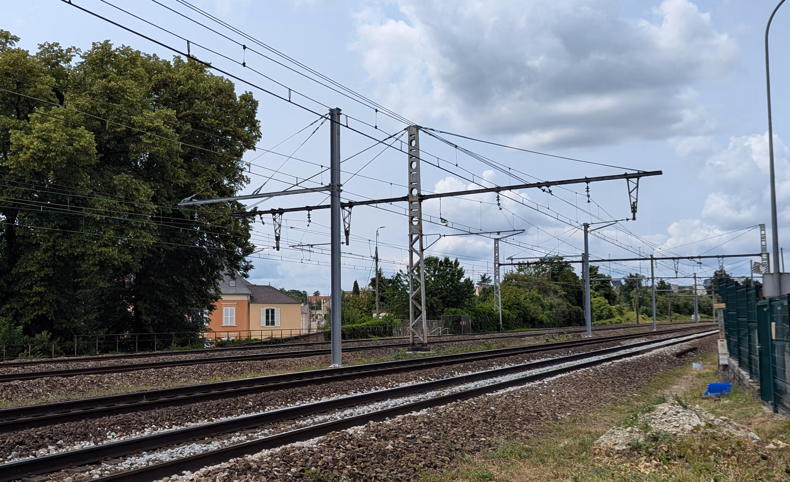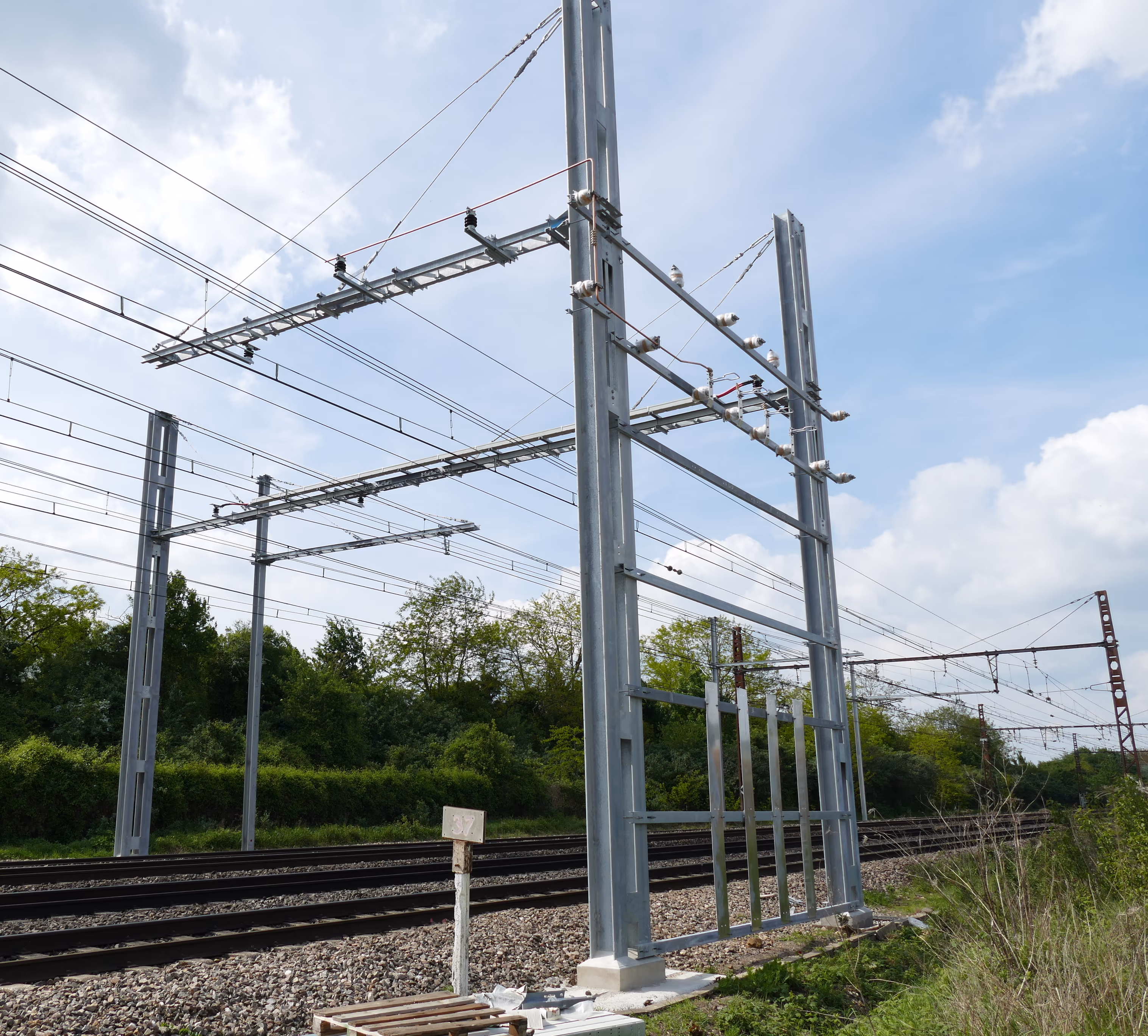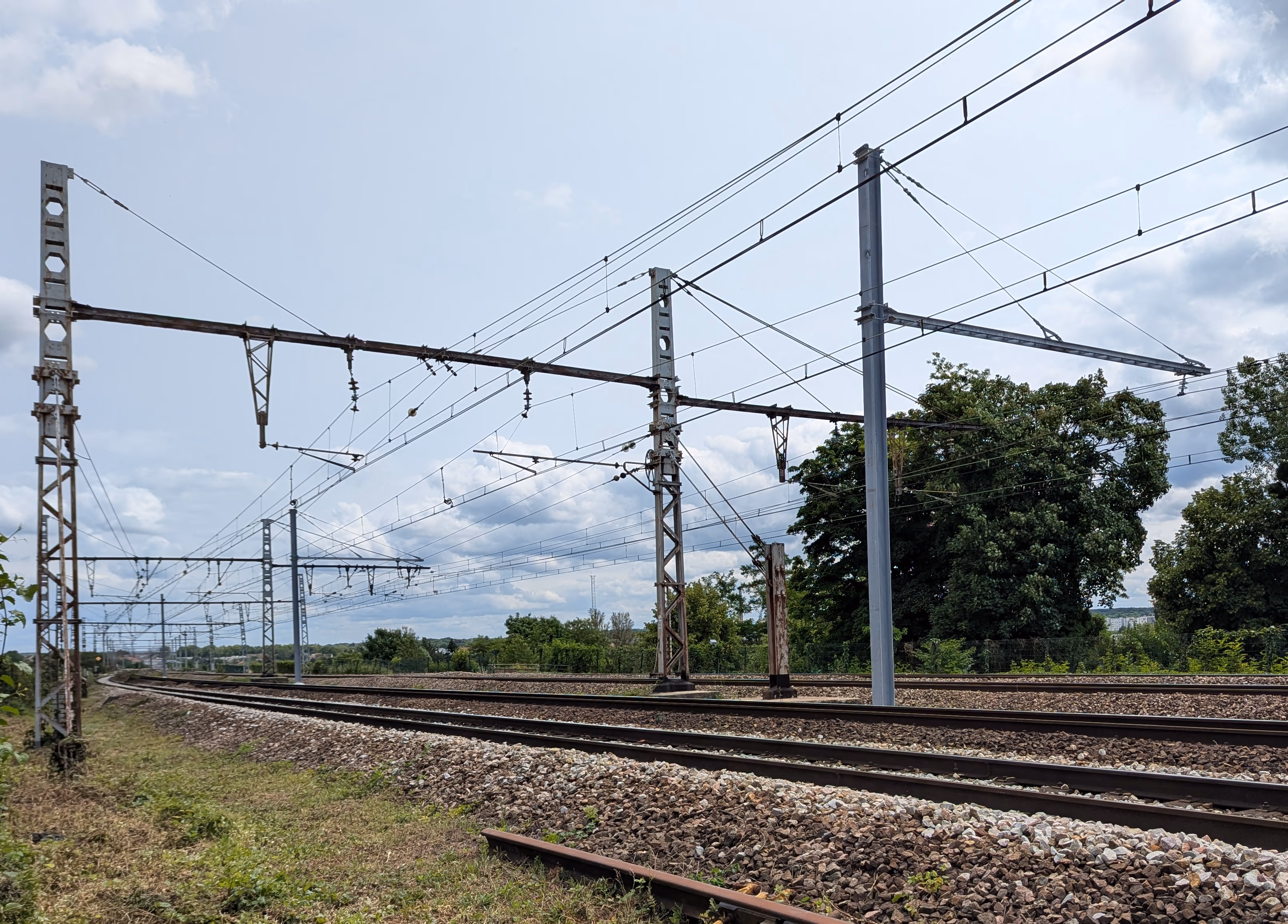 Ce n'est visiblement pas suffisant et de nouveaux câbles caténaires sont mis en place pour transporter l'énergie (c'est une ligne 1500 v donc il faut de gros câbles).