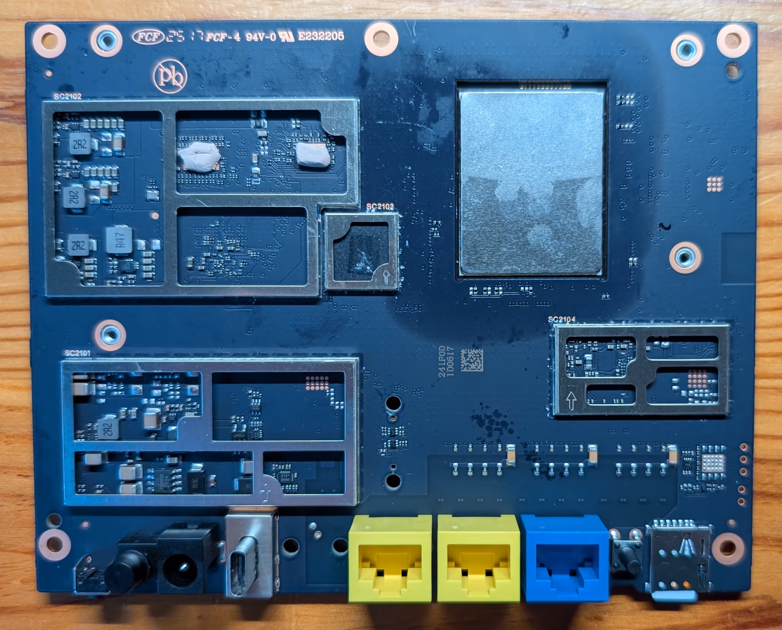 On voit un PCB noir unique pris en sandwich entre deux gros radiateurs en alu (un en face avant qu'on voit ici, et un similaire sur la face arrière).