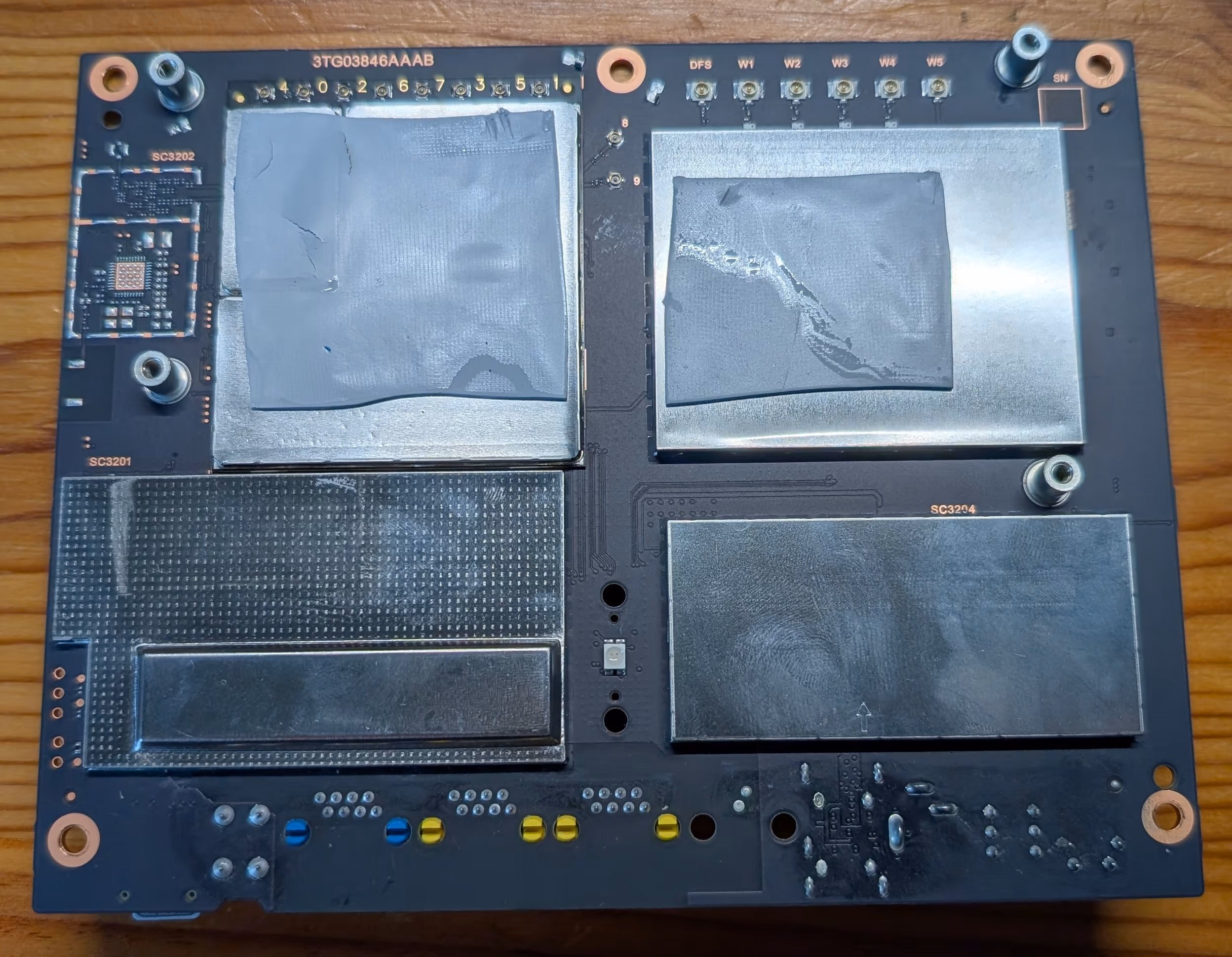 Tout en bas à gauche on retrouve les trois test pads de l'UART.
