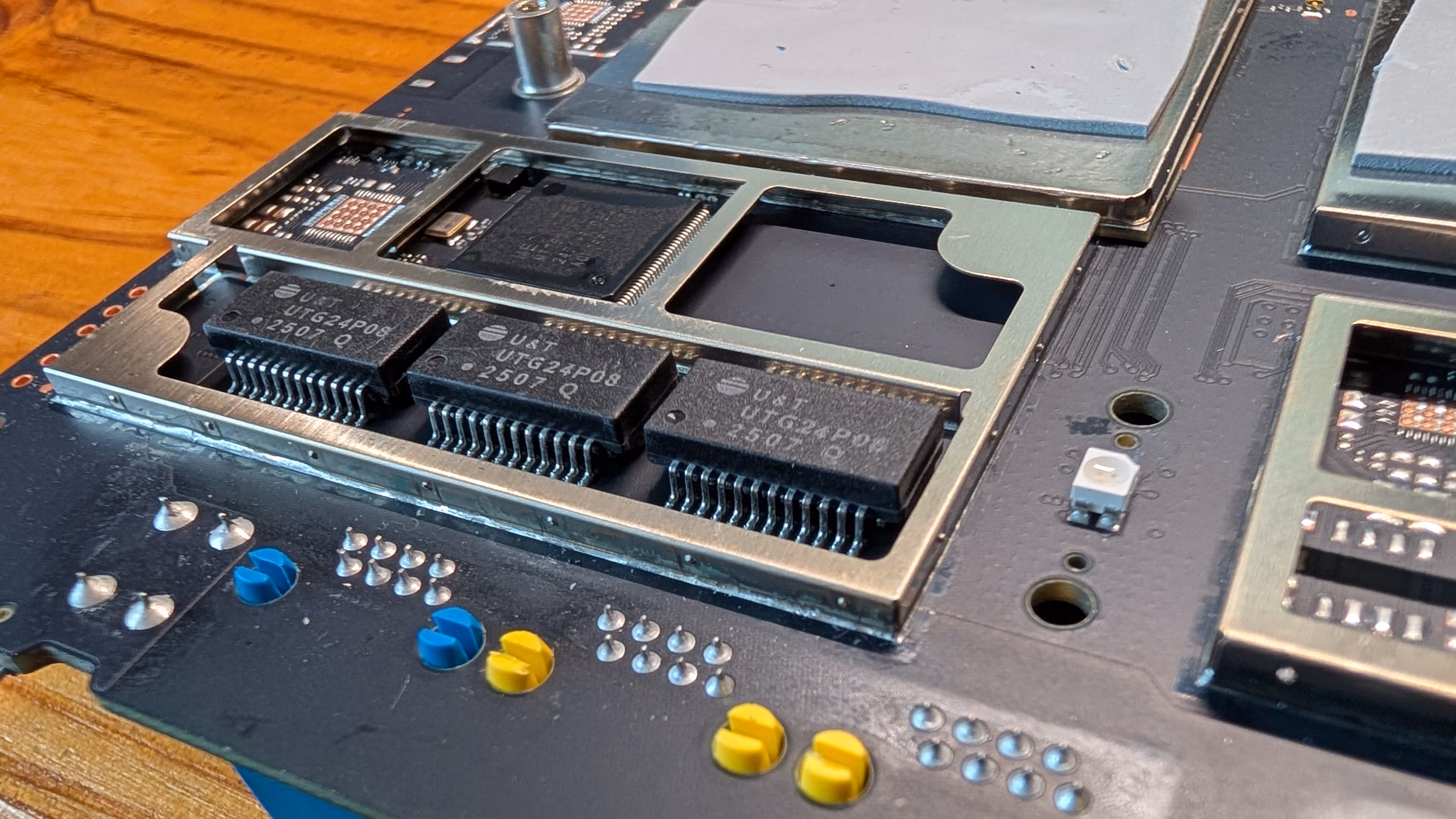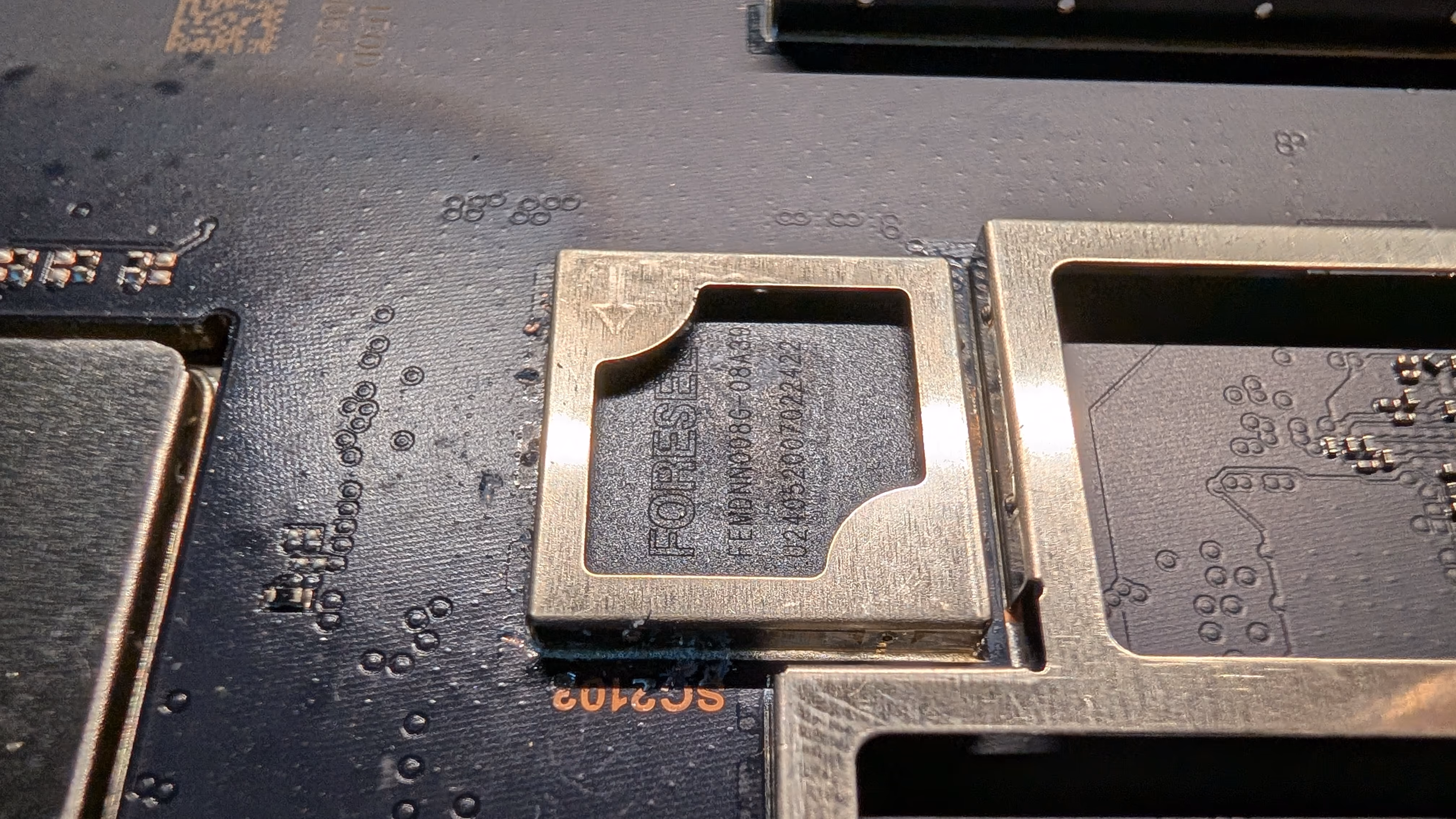 Dans le coin inférieur droit de ce bloc, sous un blindage distinct, la puce eMMC de 8GB qui contient le firmware. Il s'agit d'un chip FORSEE FEMDNN008G-08A39 dans un format BGA-153.