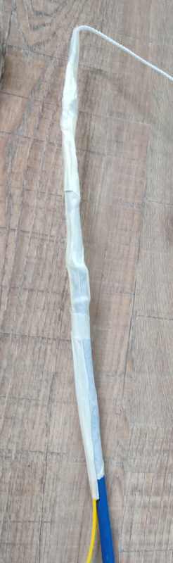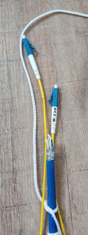 5) On attache la jarretiere+RJ45 à la ficelle,  le connecteur avant le CAT6/7 avec l'attache principale sur le cat car c'est le + solide, et du scotch électricien pour avoir un truc bien lisse,