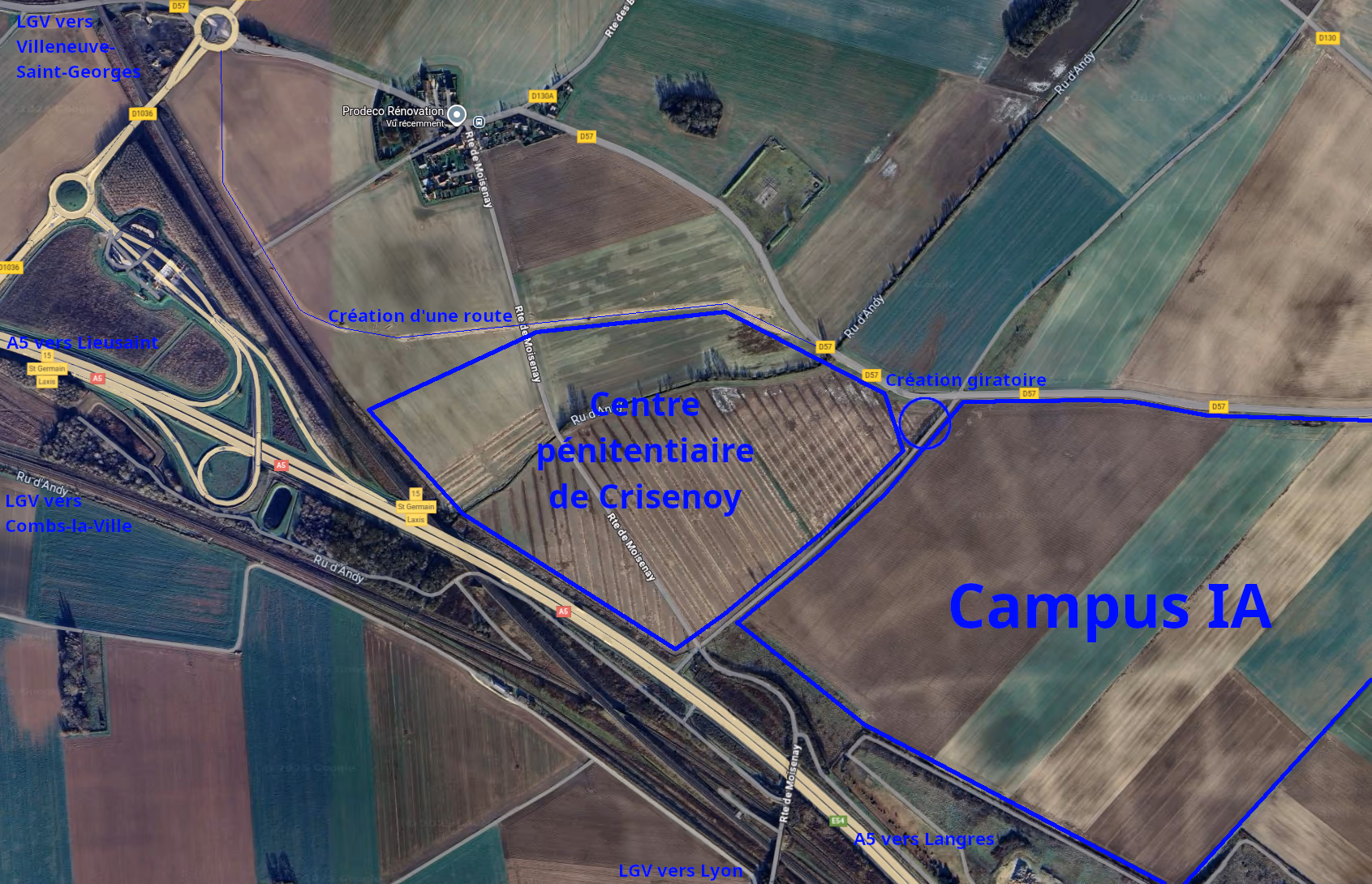 Tout ce qui est à droite sur la photo, c'est le site du futur centre pénitentiaire de Crisnoy (composé d’une maison d’arrêt de 450 places, d’un centre de détention de 300 places, d’un quartier respect de 150 places, d’un quartier d’accueil et d’évaluation de 80 places et d’un service médico-psychologique régional de 20 places).
