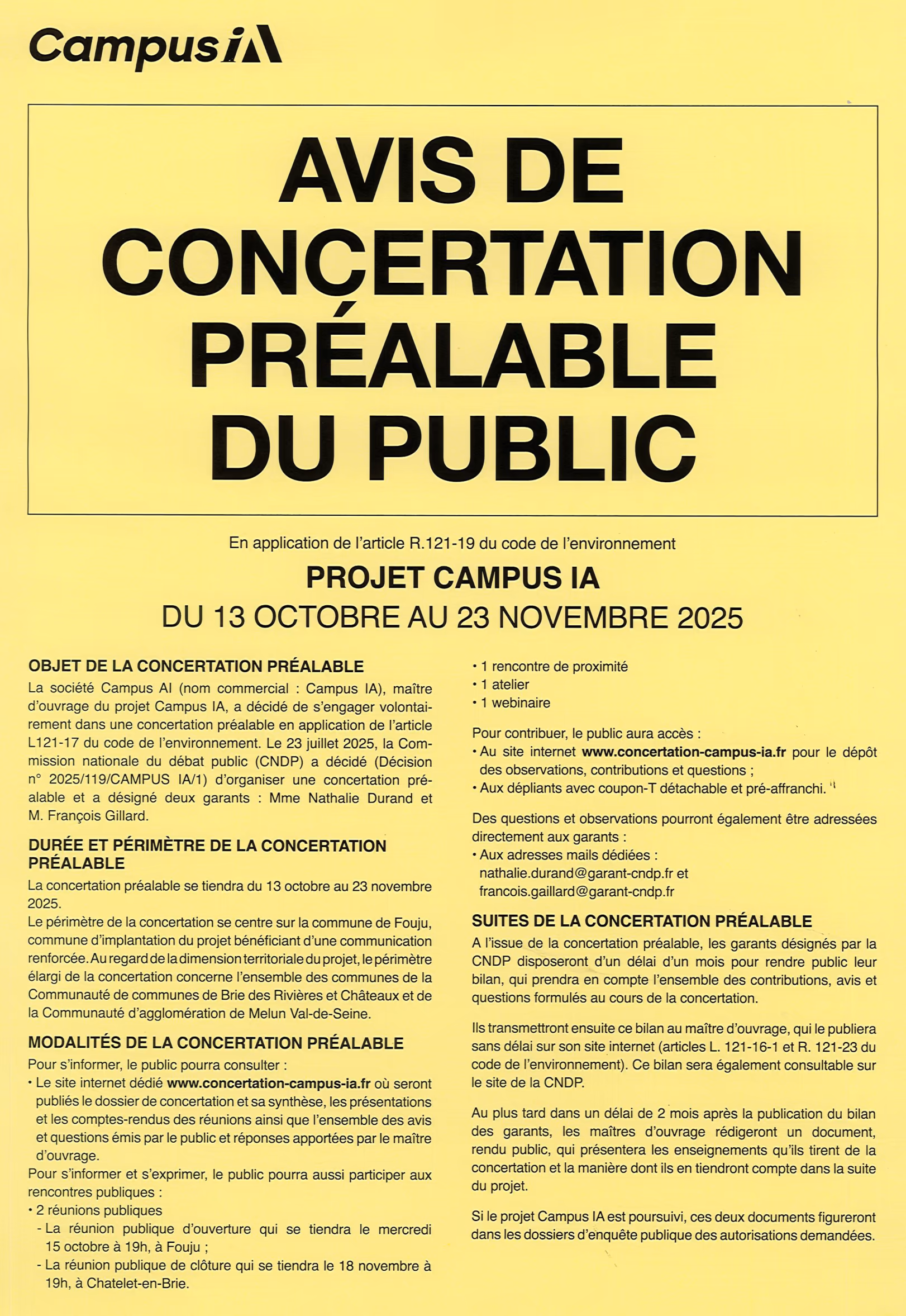 Deux réunions publiques : une d'ouverture le mercredi 15 octobre 2025 à 19h à FOUJU et une de fermeture le mardi 18 novembre 2025 à 19h au Châtelet-en-Brie.