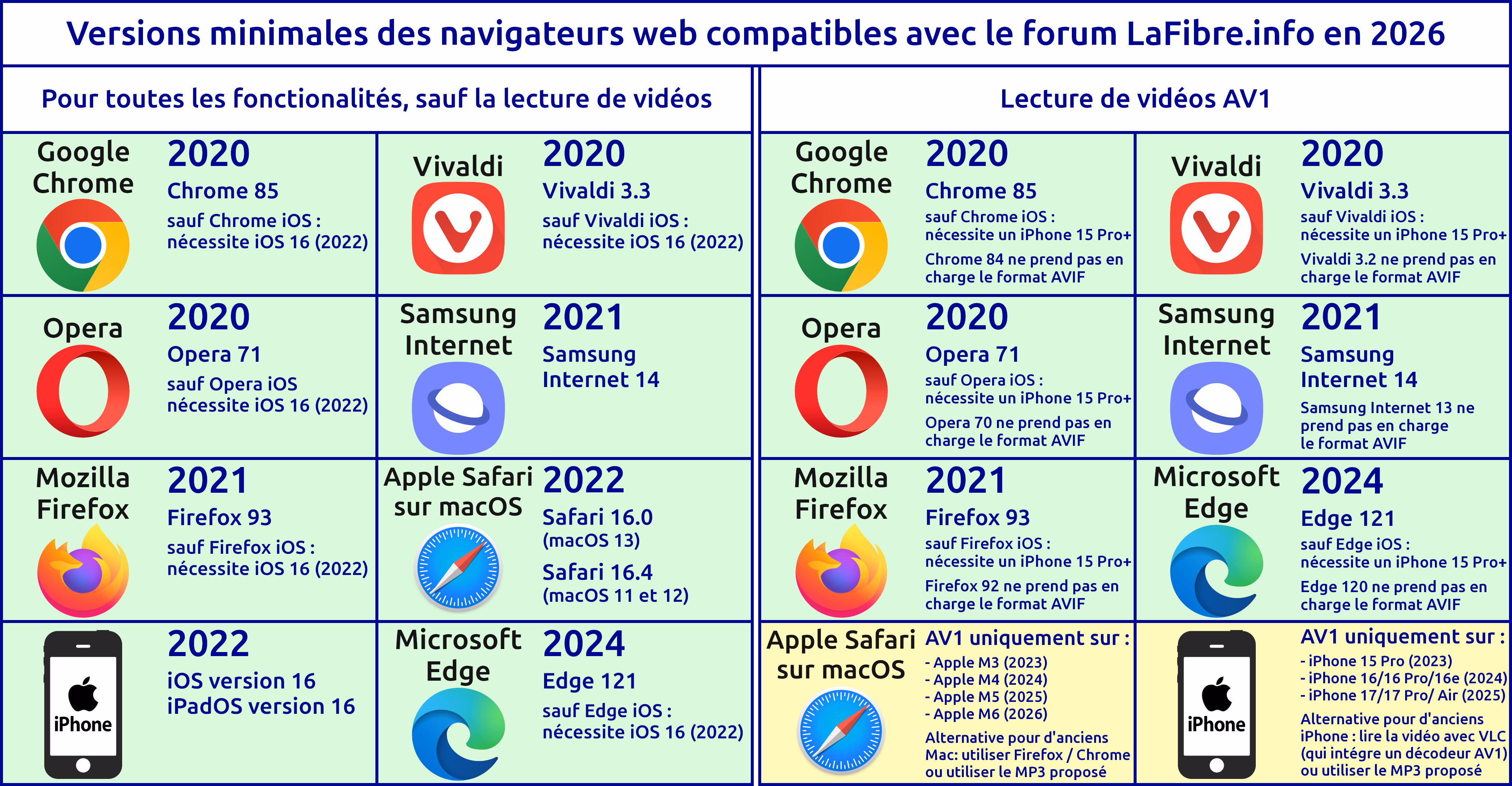 - iOS 16 (2022) : Tous les navigateurs sont compatibles avec ce forum (hors vidéo VP9)