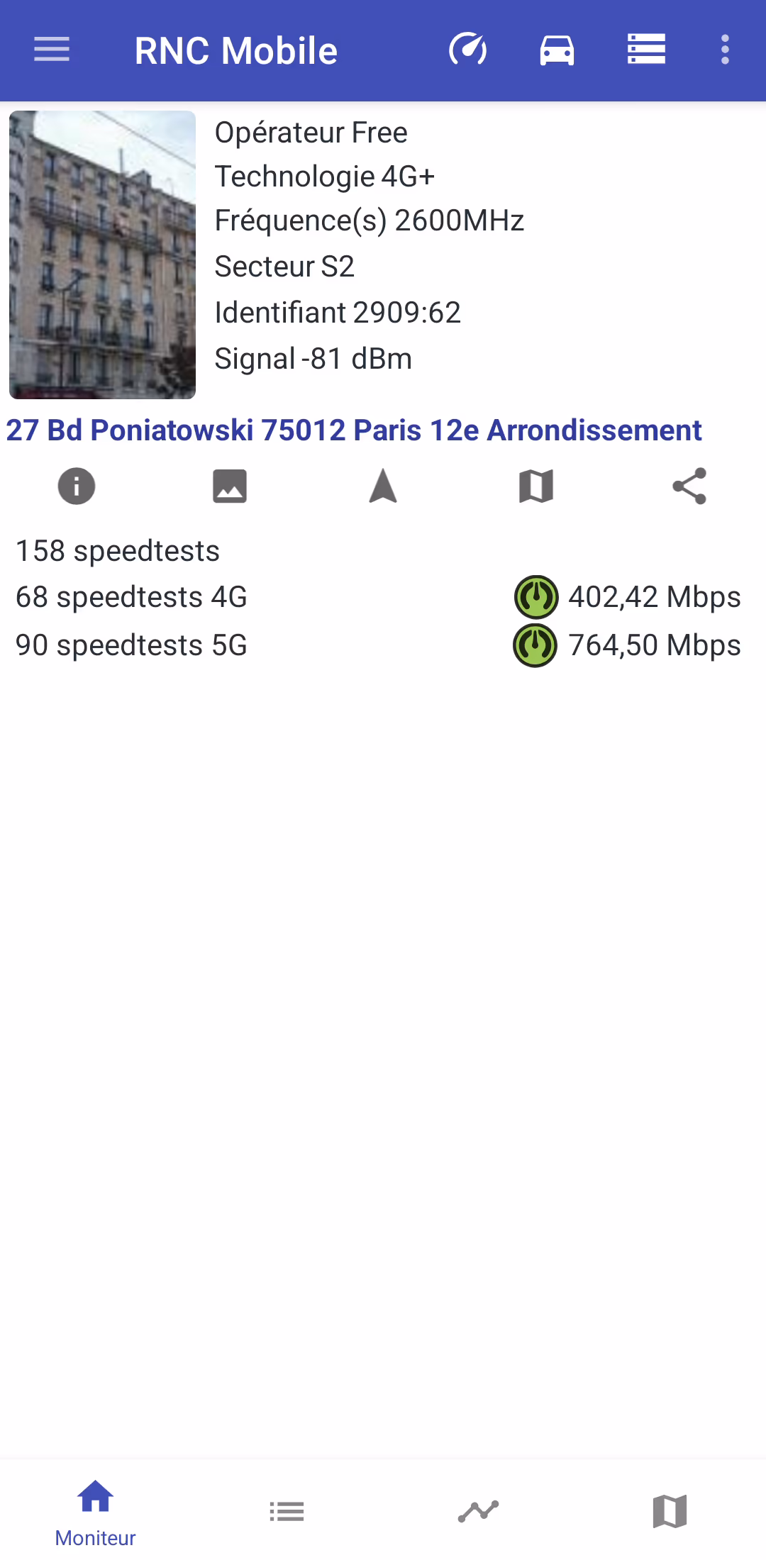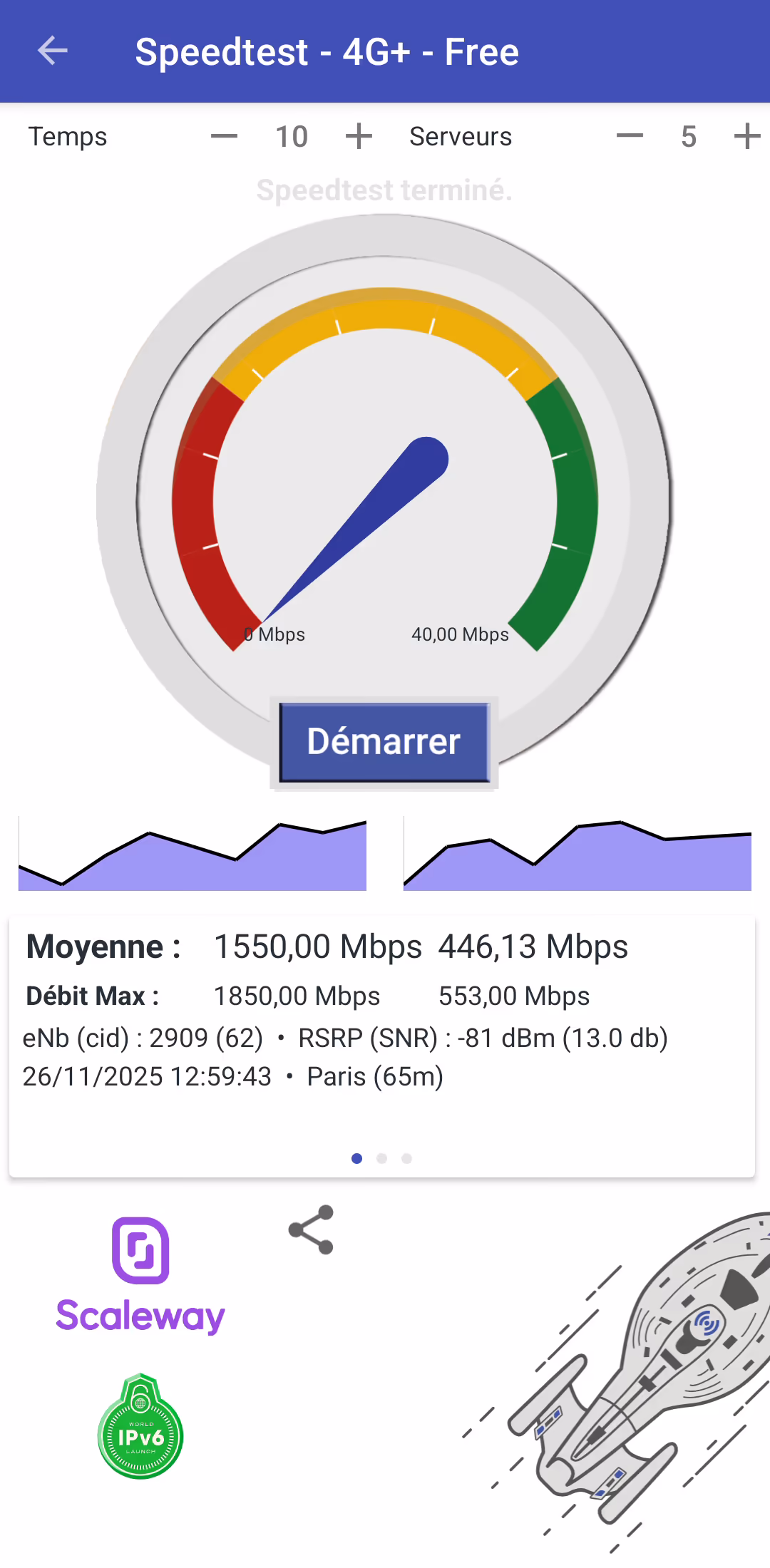 Voici les données RNC Mobile, le test de débit est complétement erroné, a cause d'une incompatibilité avec Android 15 et Android 16 (je suis avec un Pixel 6 sous Android 16)