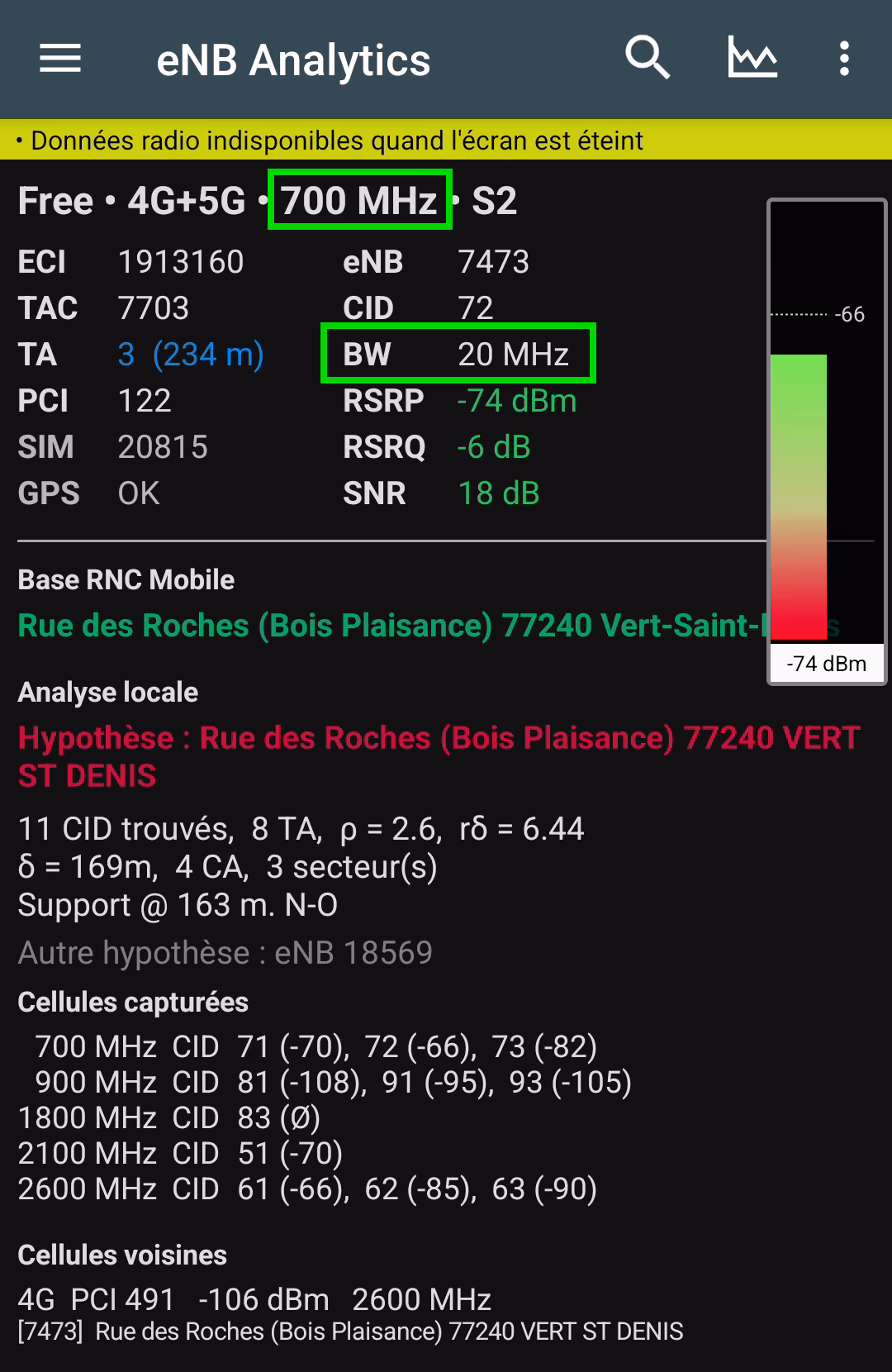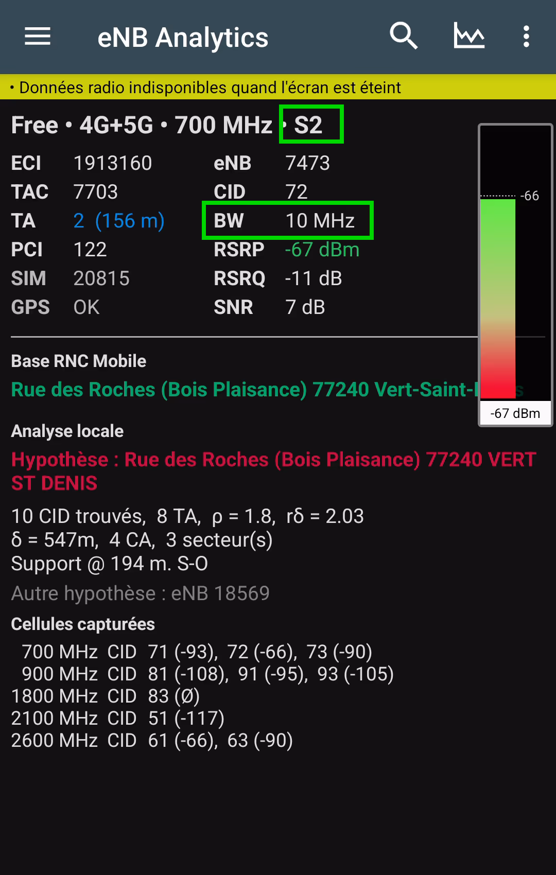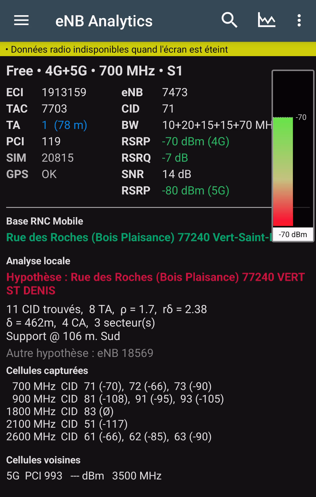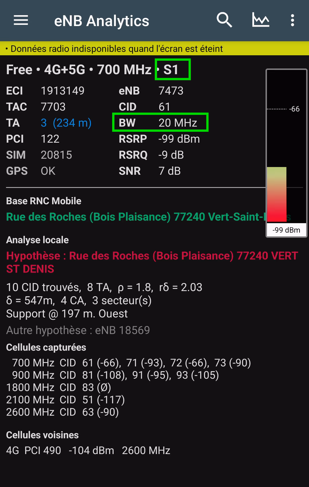 En attendant un peu, À la 40ᵉ seconde de la vidéo, alors que je suis sur eNB Analytics, mon mobile s'accroche sur le site mobile eNB 7473 qui est le site à proximité, mais pas sur le secteur 2 avec un bon signal, mais sur le secteur 1, donc le signal n'est pas bon avec un RSRP de -99 dBm.