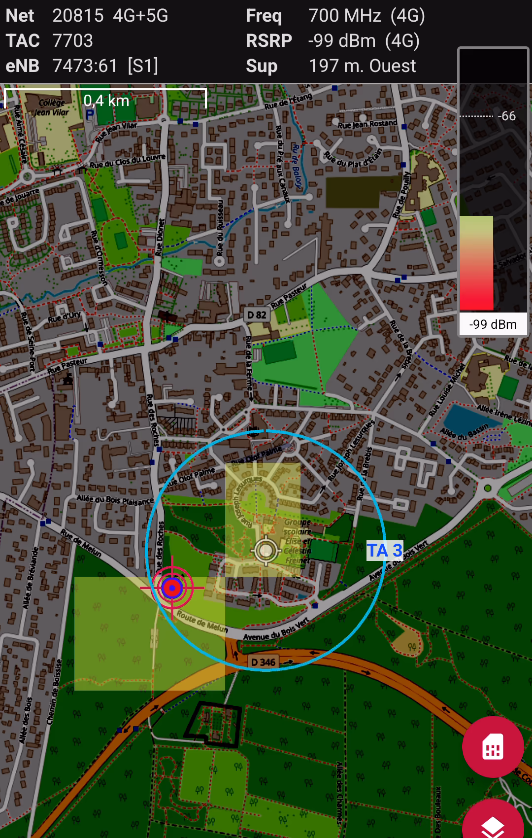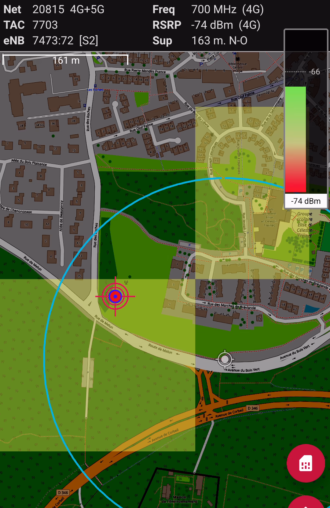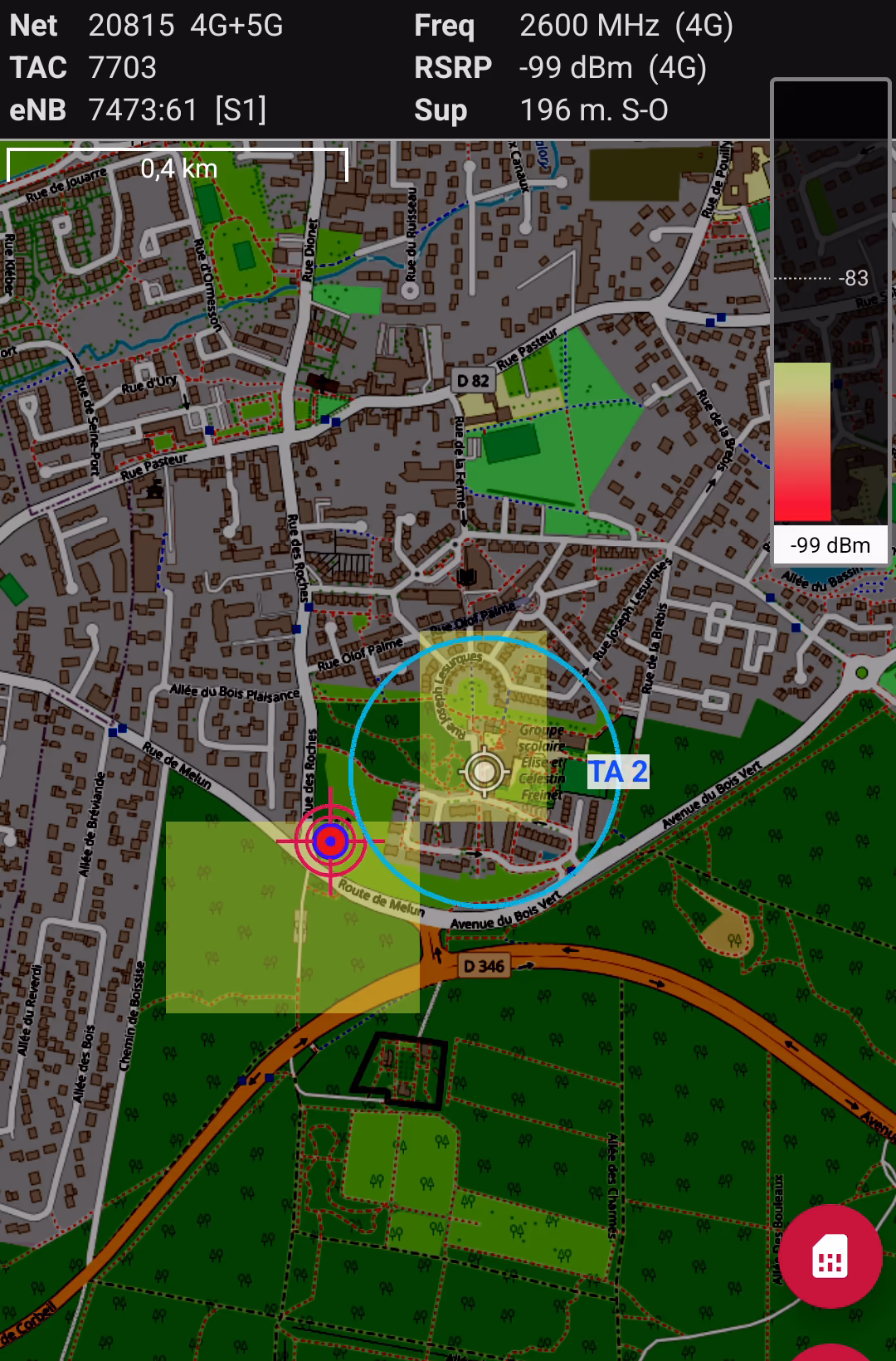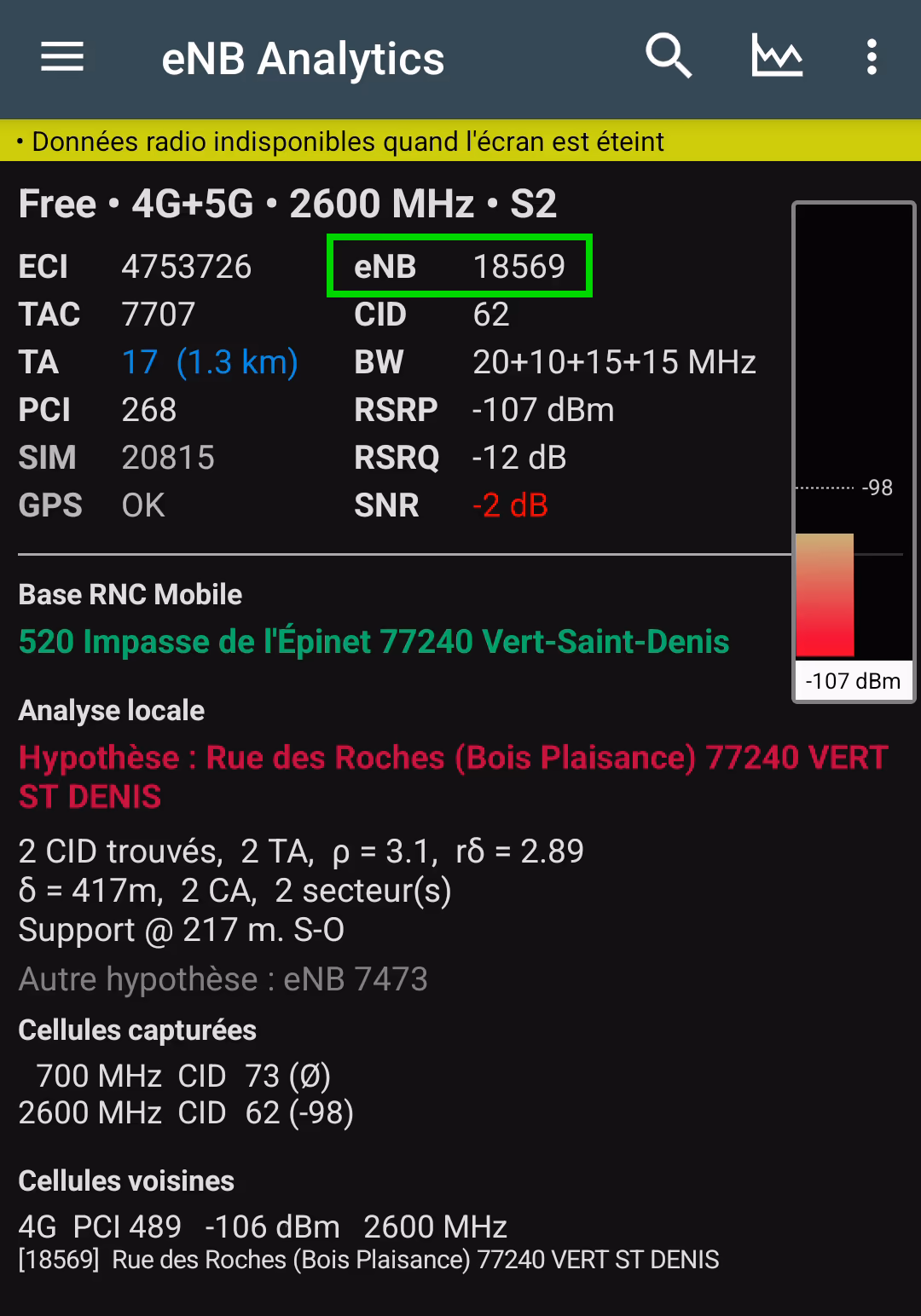 En attendant un peu, À la 40ᵉ seconde de la vidéo, alors que je suis sur eNB Analytics, mon mobile s'accroche sur le site mobile eNB 7473 qui est le site à proximité, mais pas sur le secteur 2 avec un bon signal, mais sur le secteur 1, donc le signal n'est pas bon avec un RSRP de -99 dBm.