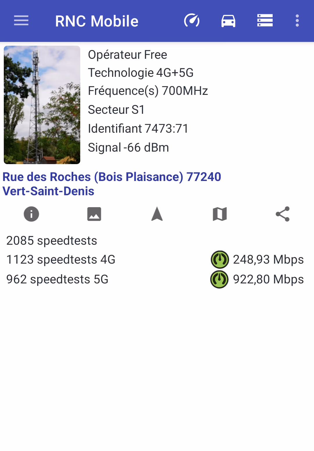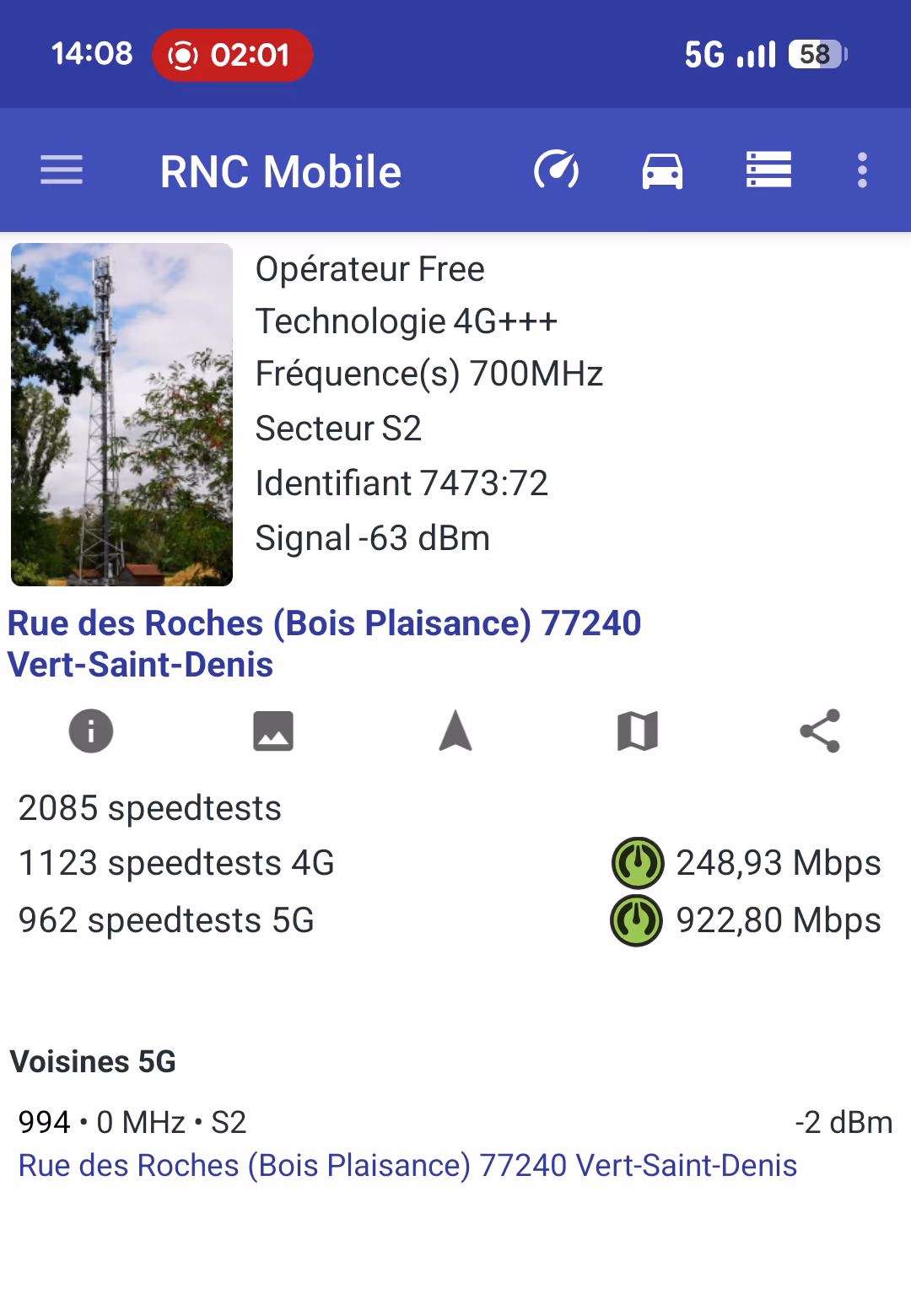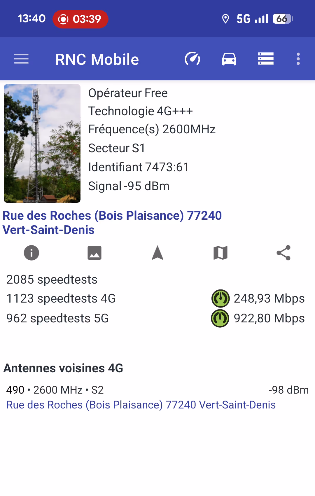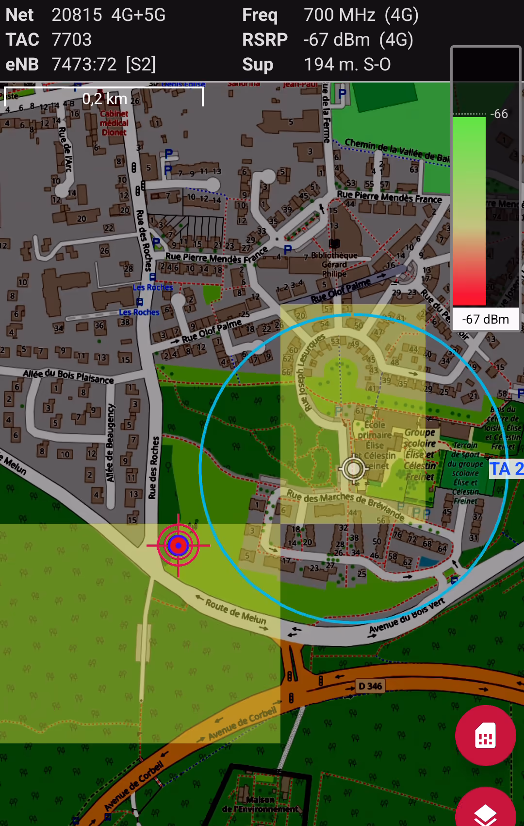 En attendant un peu, À la 40ᵉ seconde de la vidéo, alors que je suis sur eNB Analytics, mon mobile s'accroche sur le site mobile eNB 7473 qui est le site à proximité, mais pas sur le secteur 2 avec un bon signal, mais sur le secteur 1, donc le signal n'est pas bon avec un RSRP de -99 dBm.