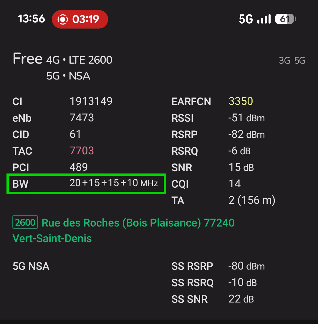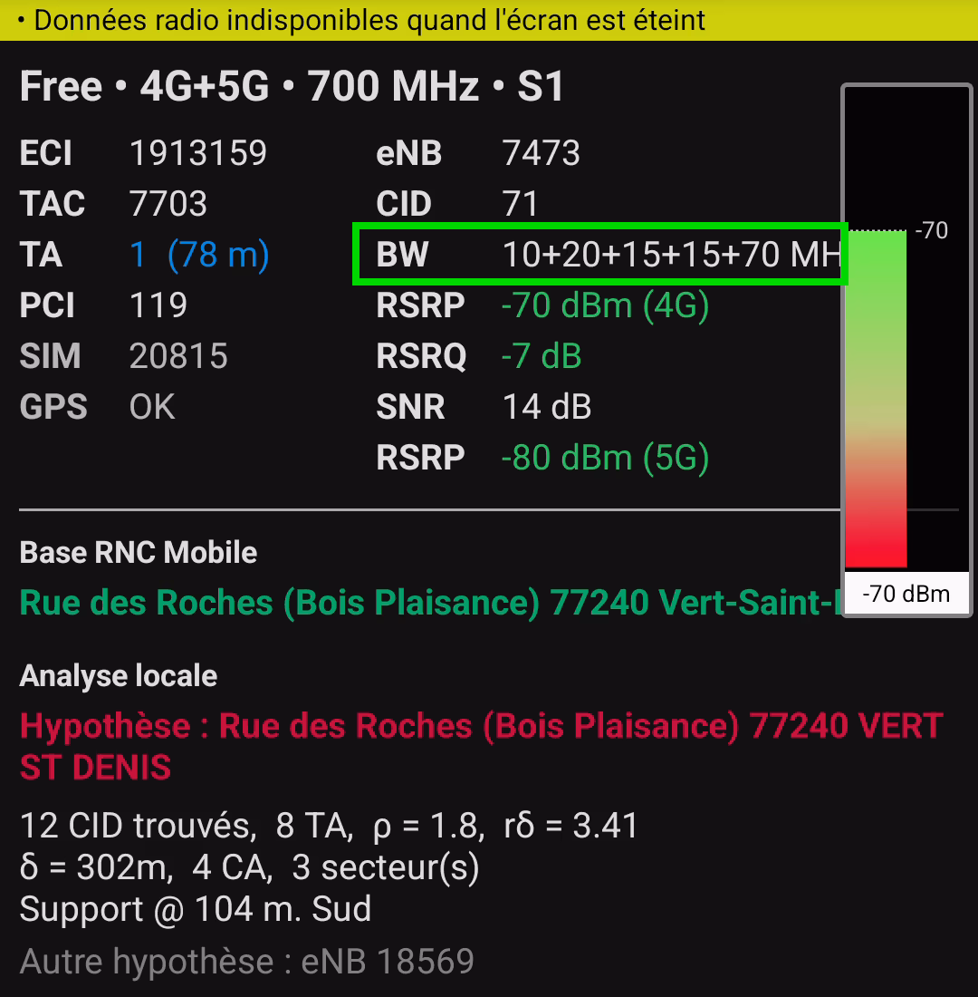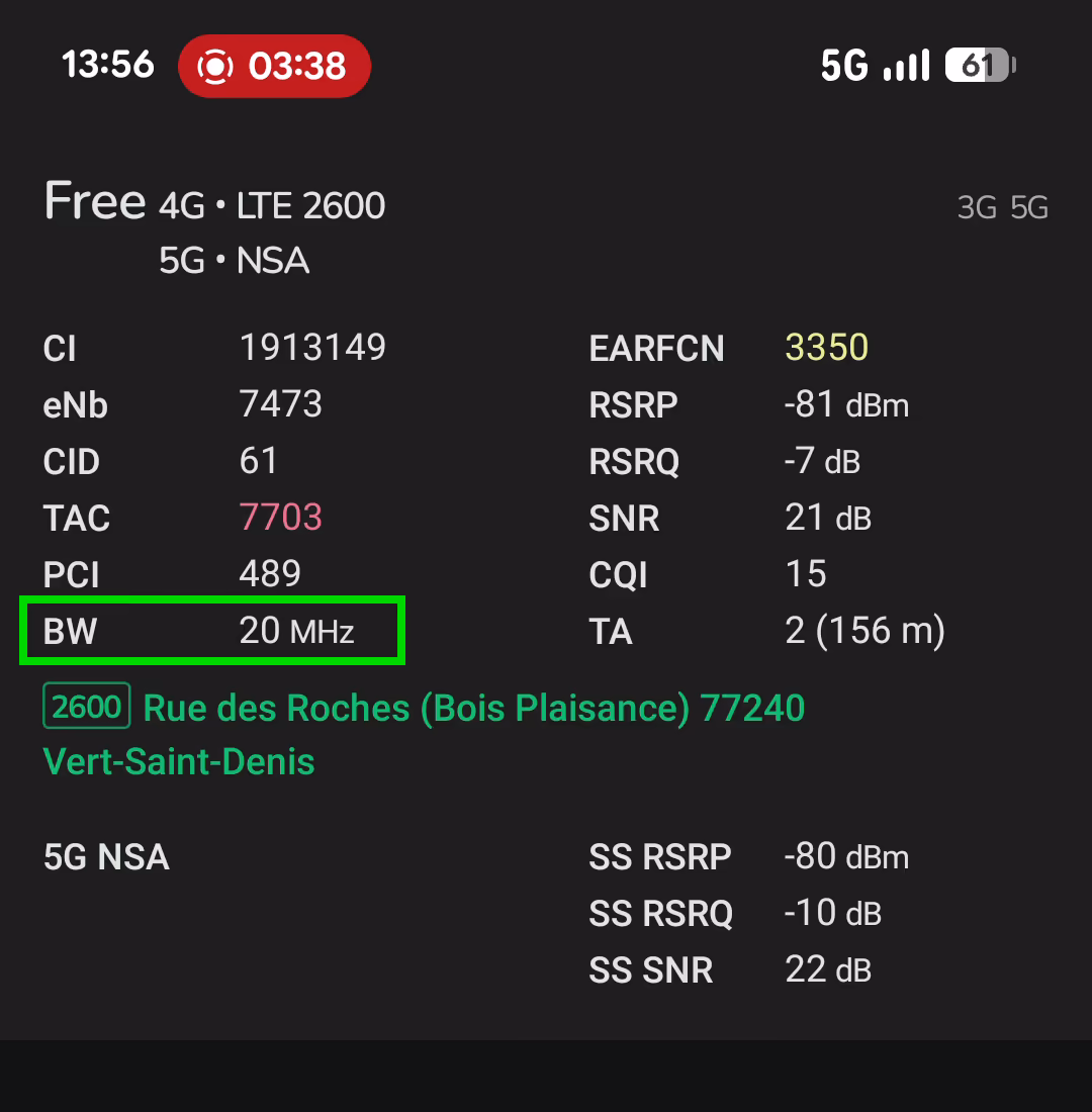 Mon mobile accroche 4 fréquences 4G pour 60 MHz, mais il ne s'est pas connecté sur la bande 3,5 GHz :