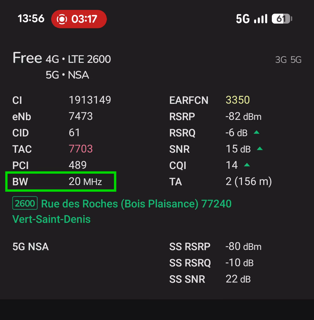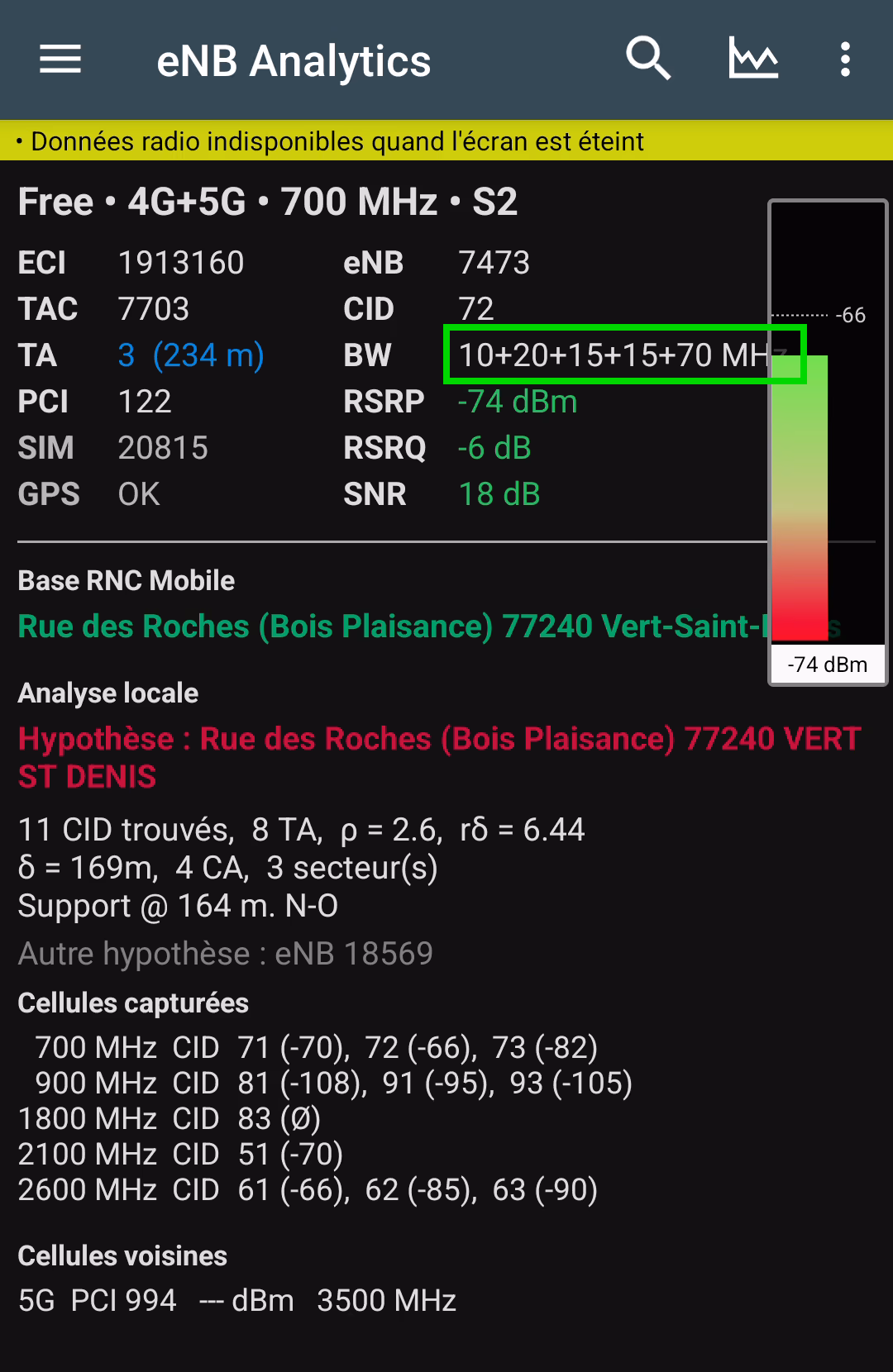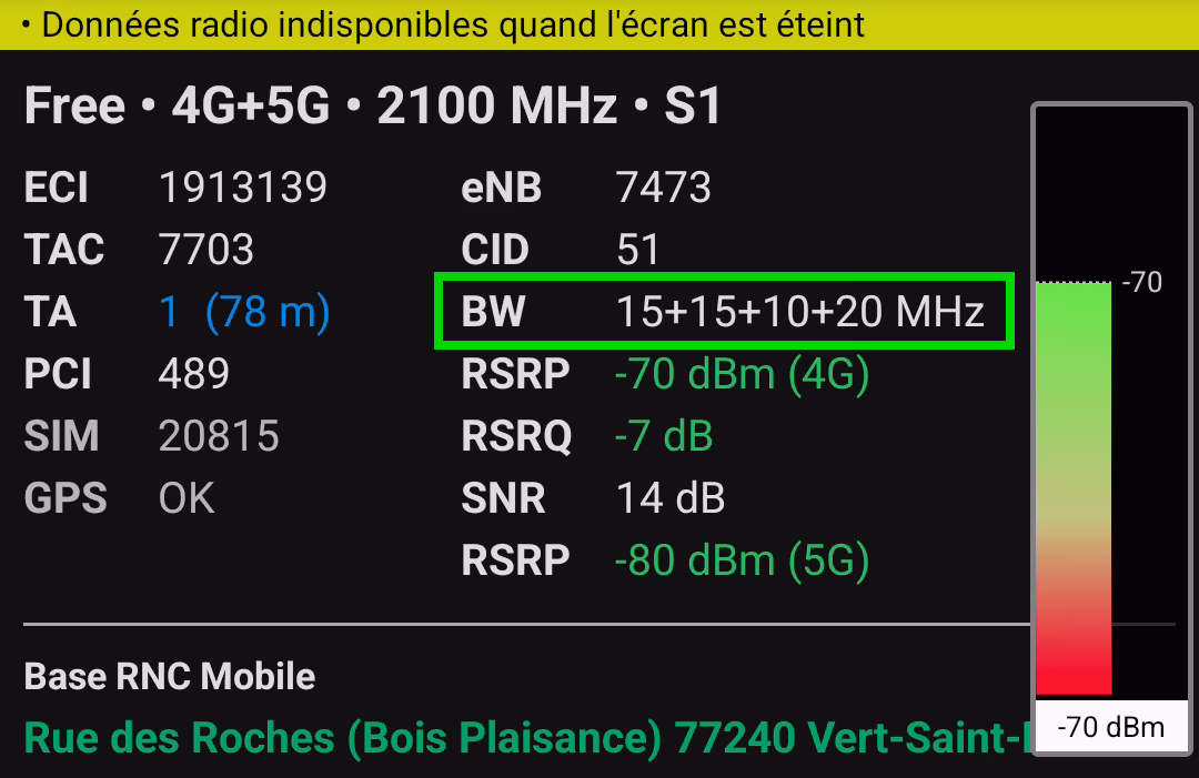 Mon mobile accroche 4 fréquences 4G pour 60 MHz, mais il ne s'est pas connecté sur la bande 3,5 GHz :