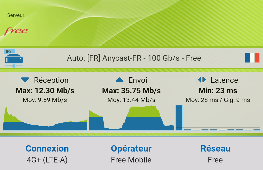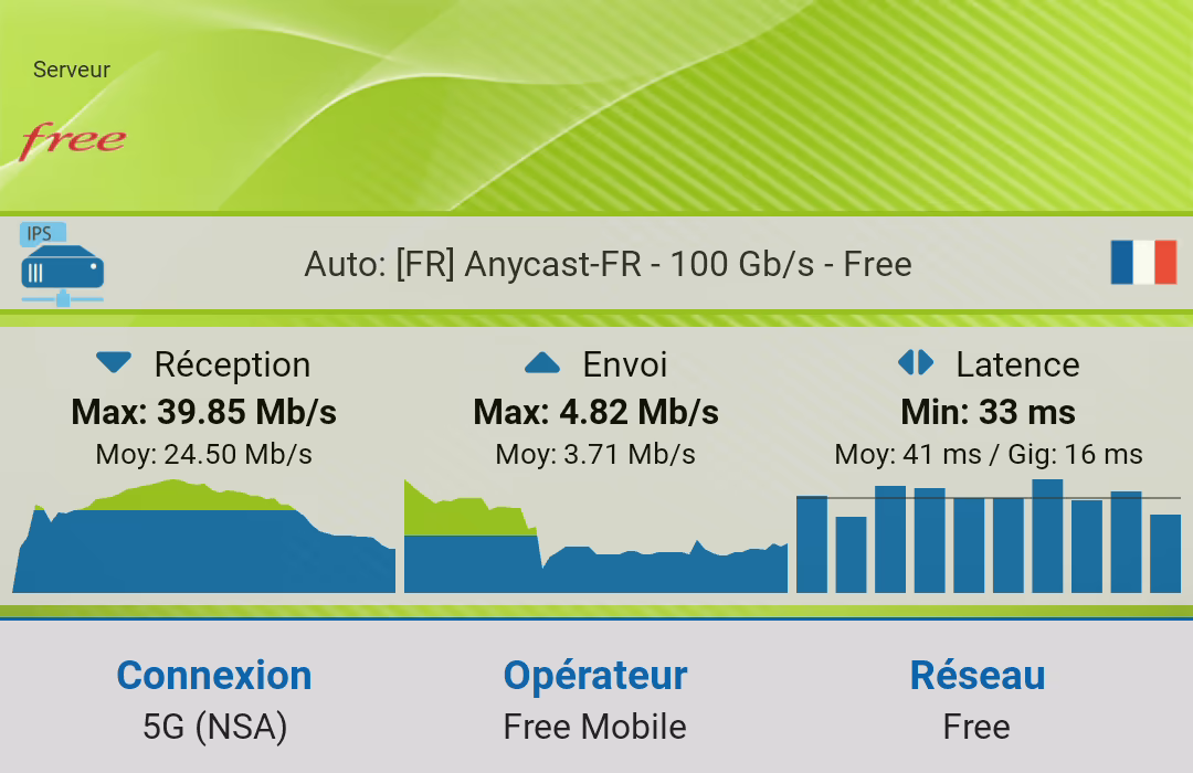 En ce qui me concerne, j'ai deux cartes SIM, une Free, et une Bouygues Telecom (120 Go de data, 5G). Ces derniers jours, n'ayant pas de data en voiture avec Waze, j'ai basculé la data sur Bouygues Telecom pour retrouver de la data. Par contre, chez moi, aux Ulis, les débits ne sont pas très bons, que ce soit chez Free mobile ou chez Bouygues Telecom (mais donc cela n'a pas trop d'importance puisque je suis en WiFi). Le débit était un peu meilleur chez Free mobile ce soir, 12 Mb/s avec Free moble, 4 Mb/s avec Bouygues Telecom.