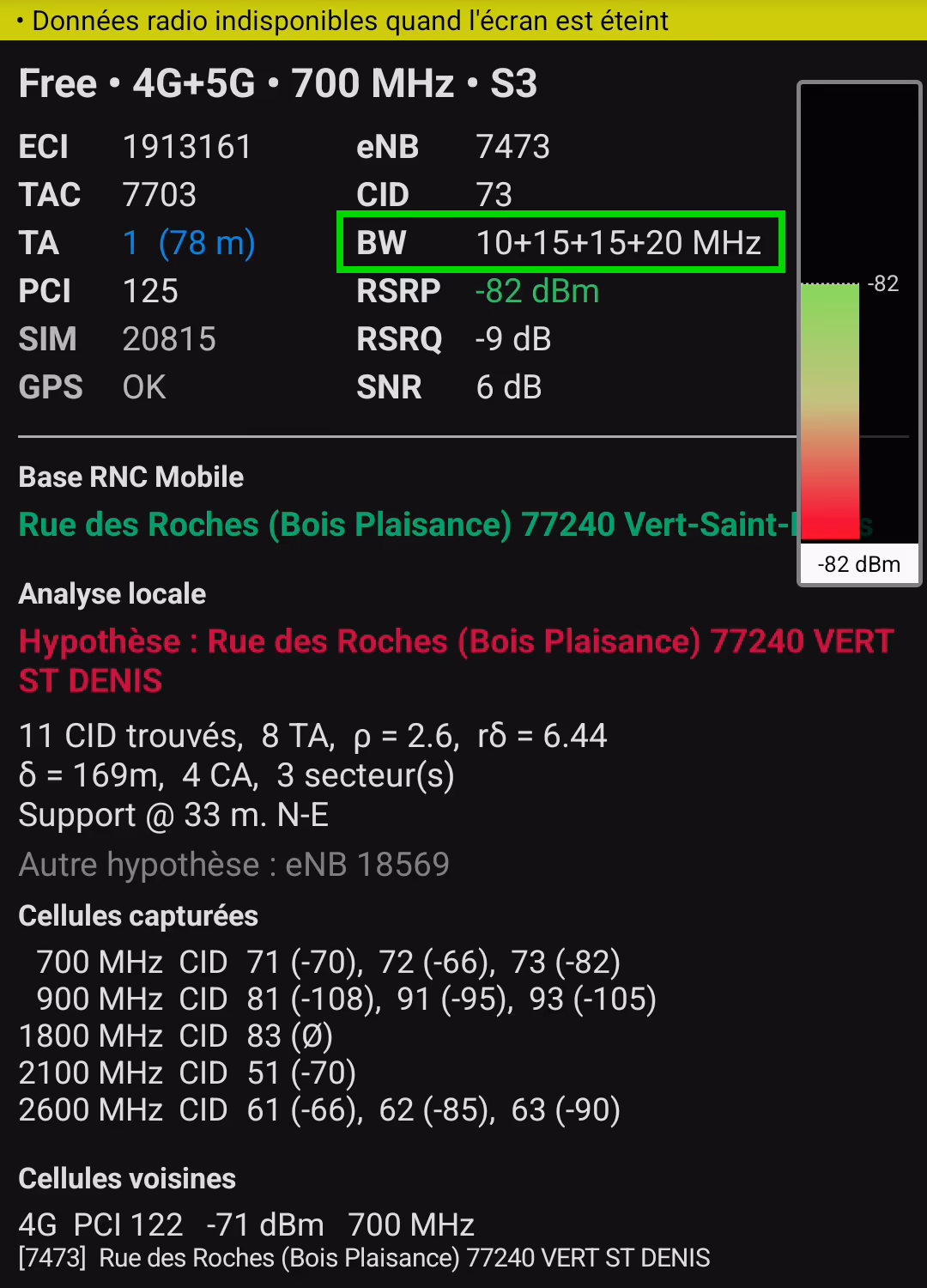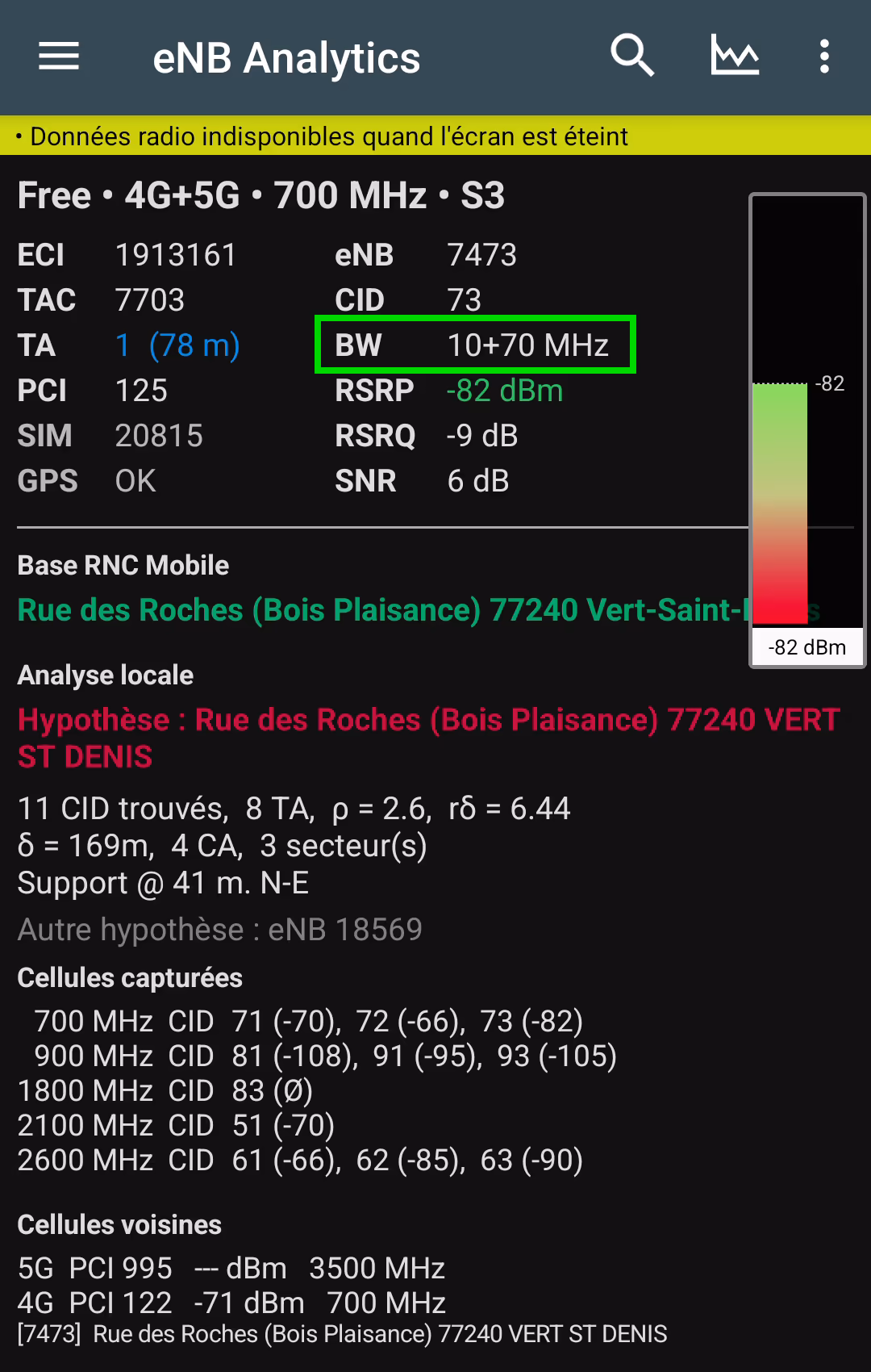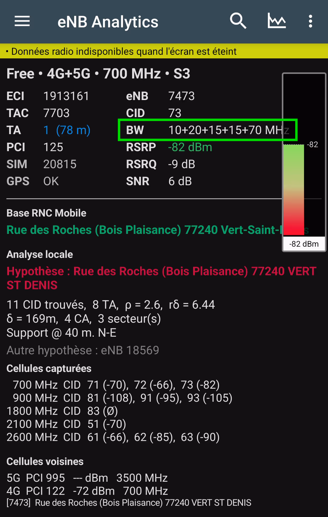Je ne sais pas si je suis trop proche de l'antenne (39 mètres d'après eNB Analytics, ce qui semble correct quand je mesure la distance sur une carte), mais je suis déçu d'avoir -82 dBm de RSRP. Je m'attendais à avoir un meilleur signal (mais cela reste un bon signal, sans être excellent).