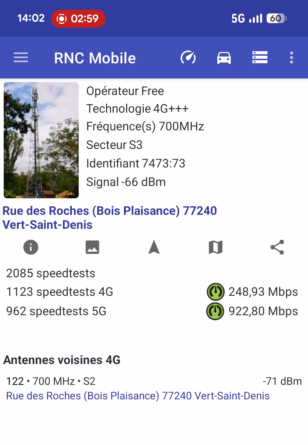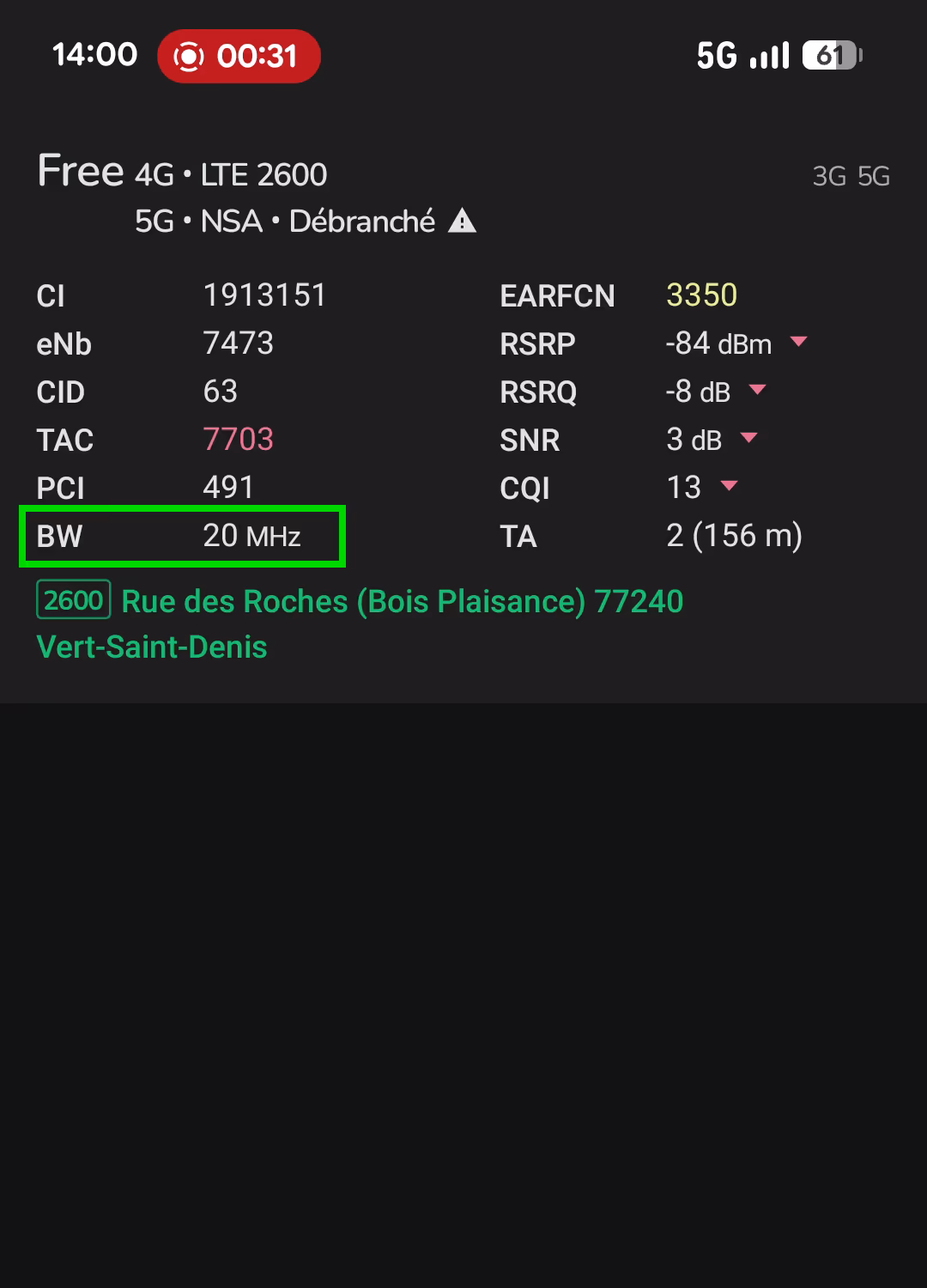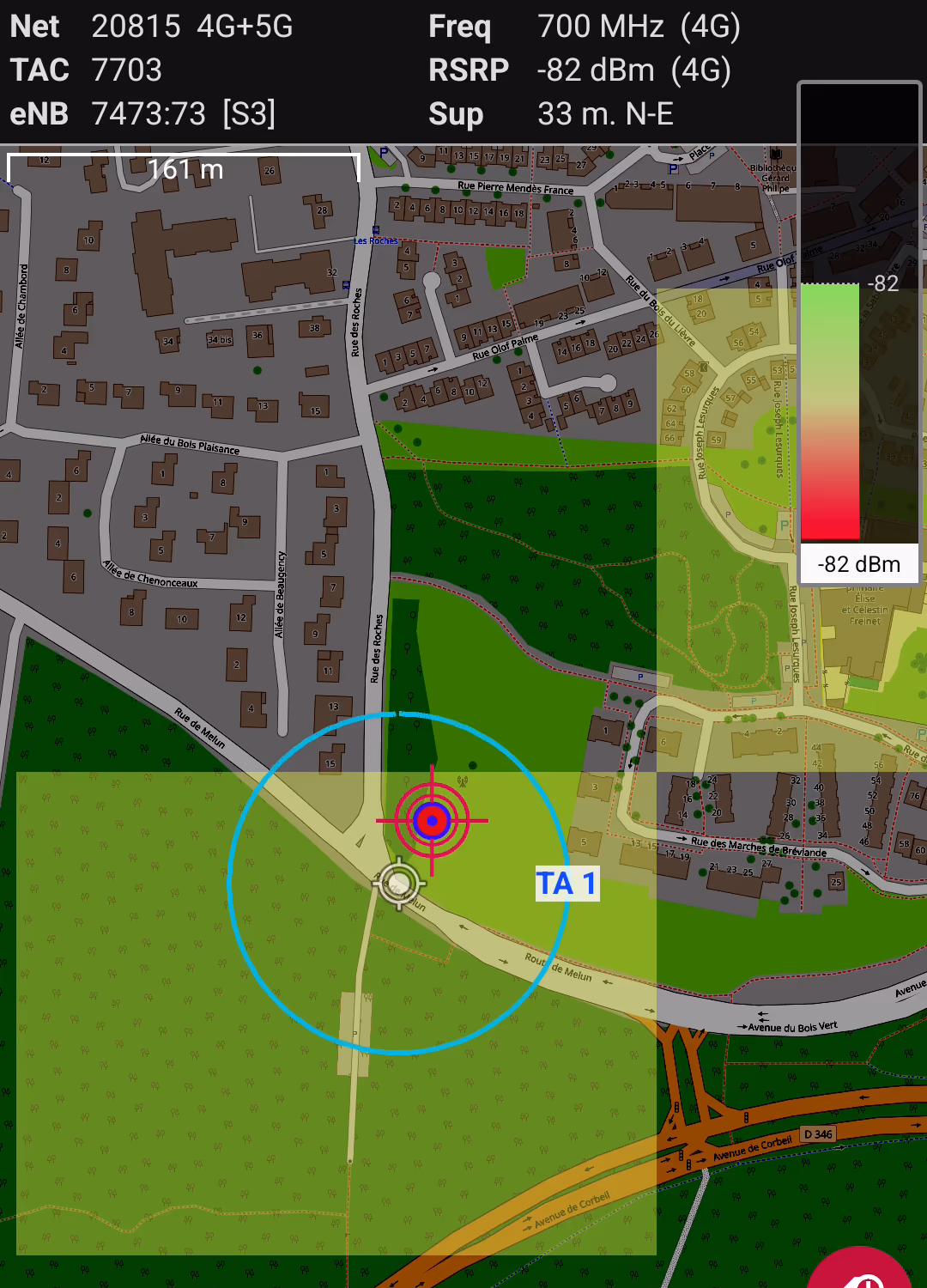 Je ne sais pas si je suis trop proche de l'antenne (39 mètres d'après eNB Analytics, ce qui semble correct quand je mesure la distance sur une carte), mais je suis déçu d'avoir -82 dBm de RSRP. Je m'attendais à avoir un meilleur signal (mais cela reste un bon signal, sans être excellent).