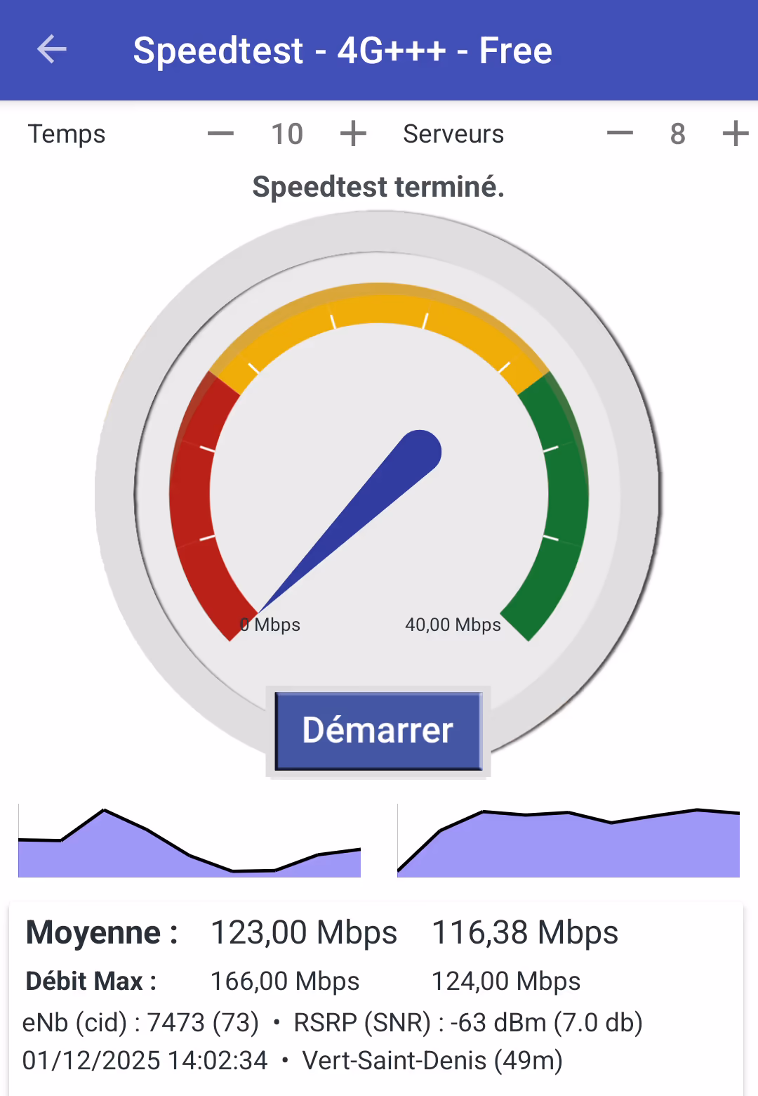 Voici le nPerf, lancé alors que le mobile agrège 60 MHz de fréquences 4G : 9,6 Mb/s de débit moyen descendant, c'est vraiment décevant, avec ces conditions radio et sur un secteur qui dessert la foret (donc peu de clients) on devrait dépasser les 200 Mb/s.