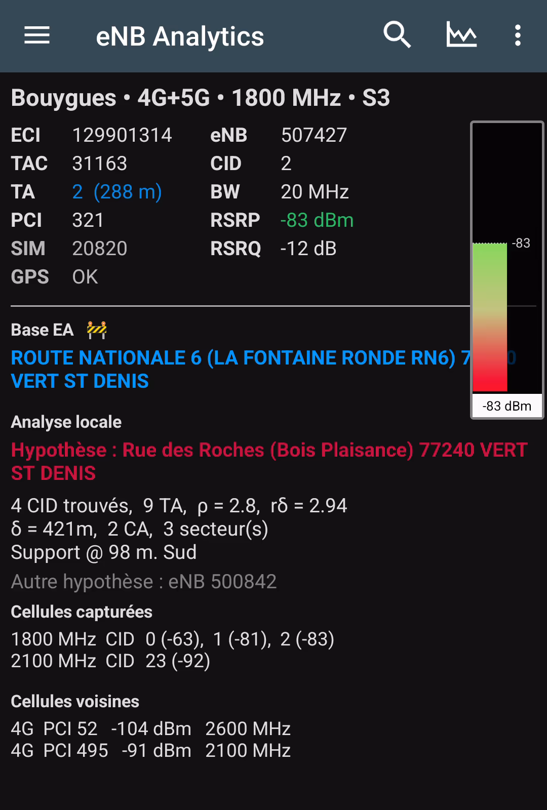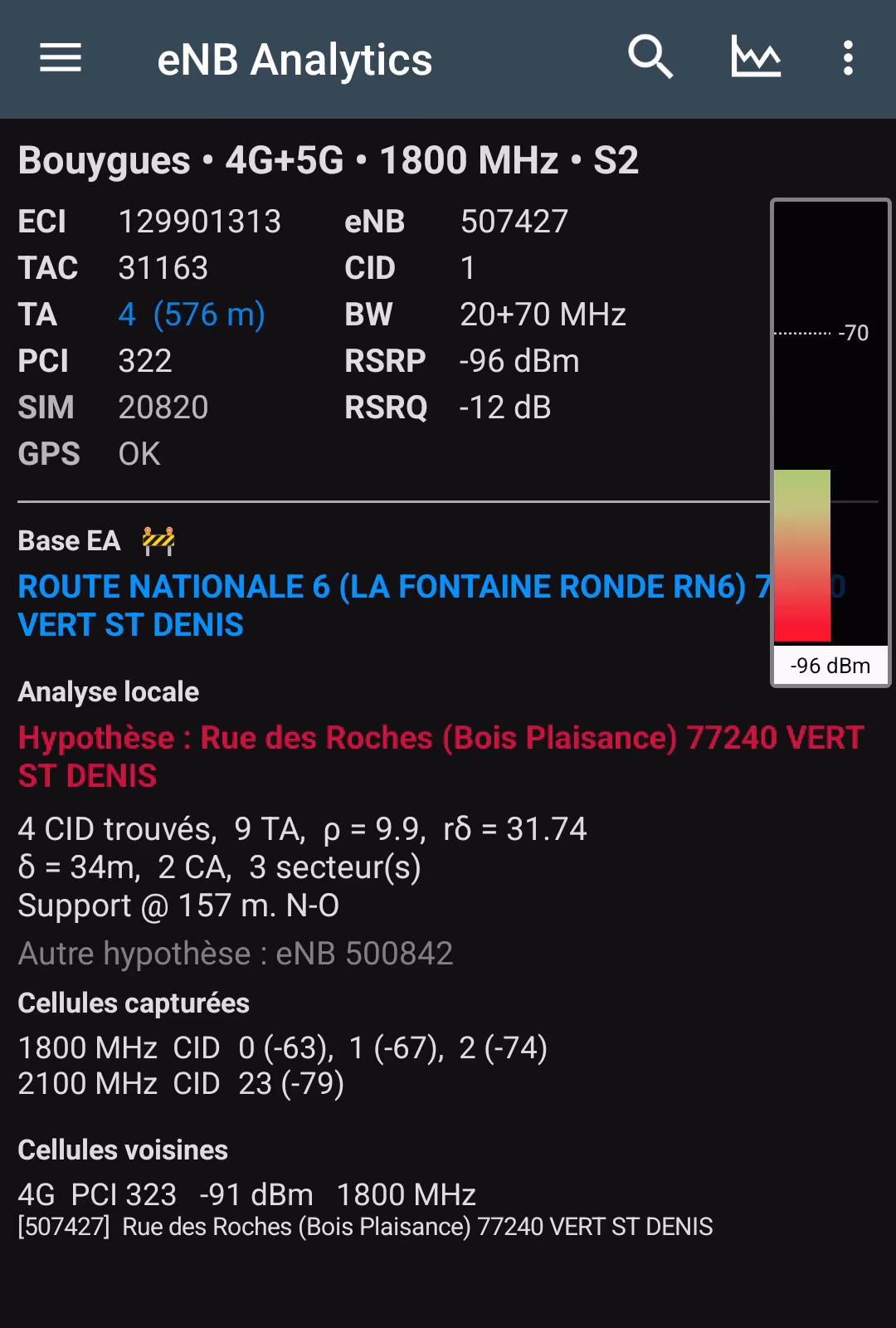En attendant un peu, À la 40ᵉ seconde de la vidéo, alors que je suis sur eNB Analytics, mon mobile s'accroche sur le site mobile eNB 7473 qui est le site à proximité, mais pas sur le secteur 2 avec un bon signal, mais sur le secteur 1, donc le signal n'est pas bon avec un RSRP de -99 dBm.