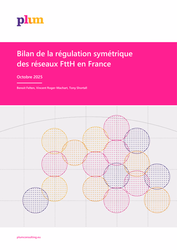 L’étude présente d’abord une synthèse du fonctionnement du cadre de régulation symétrique. Elle constate ensuite les résultats produits par ce cadre. Au regard des principaux objectifs poursuivis à l’échelle européenne, le bilan s’avère positif, en matière de déploiement de la fibre optique sur le territoire, d’efficacité des investissements, de concurrence entre les opérateurs, mais aussi de prix de détail pour les consommateurs. L’étude de Plum compare ensuite le modèle français à celui d’autres États membres, et s’interroge enfin sur l’impact d’éventuelles évolutions règlementaires au travers de quelques scénarios.
