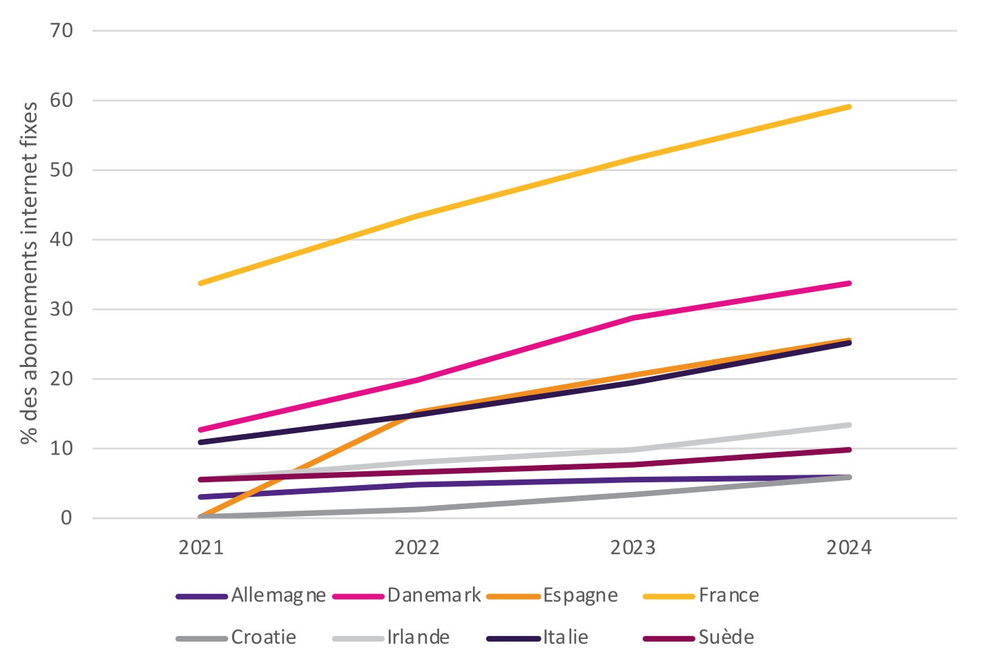En 2024, en France, près de 60% des abonnements internet fixe donnent accès à des débits égaux ou supérieurs à 1 Gbit/s. (Sources : rapport DESI 2025 de la Commission européenne)