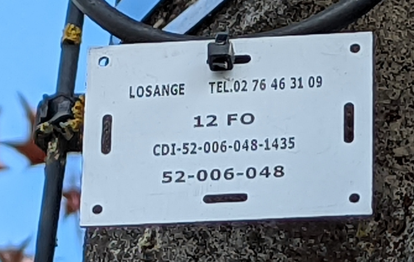 Dans ma commune de Haute Marne, Losange déploie la fibre (Grand Est). Ma commune (commune nouvelle) est constituée de 2 villages proches, le premier est ouvert à la commercialisation depuis octobre 2021. J'habite dans le deuxième et les travaux sont en cours dans ma rue. Le boitier PBO a été installé dans le regard en face de chez moi et des techniciens travaillent régulièrement dans l'armoire SRO un peu plus loin