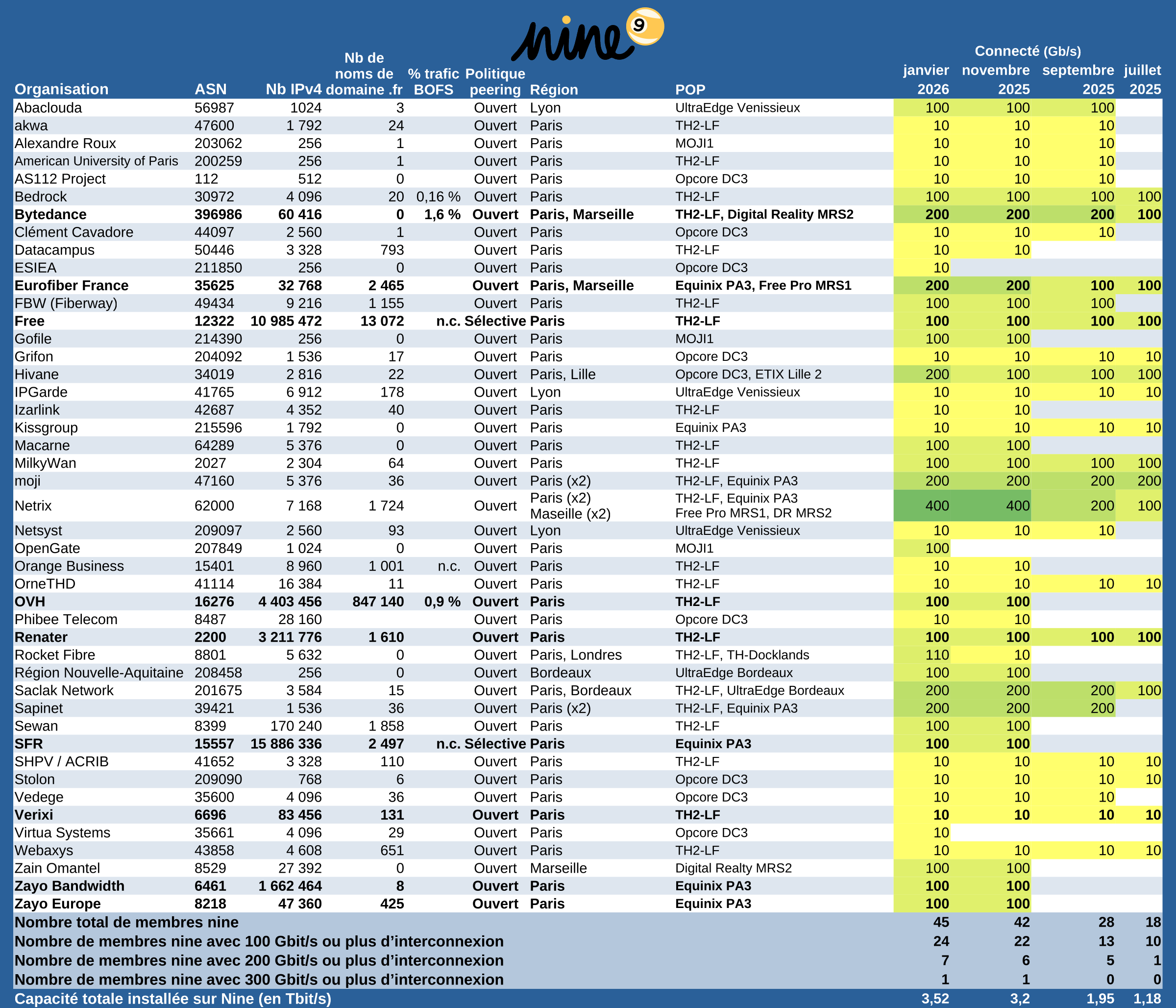 J'ai retiré les opérateurs qui avaient annoncés au printemps venir sur Nine et qui ne sont toujours pas présent (ex: Cloudflare, F5, OUtscale,...) : il n'y a plus de lignes avec des acteurs non connectés.