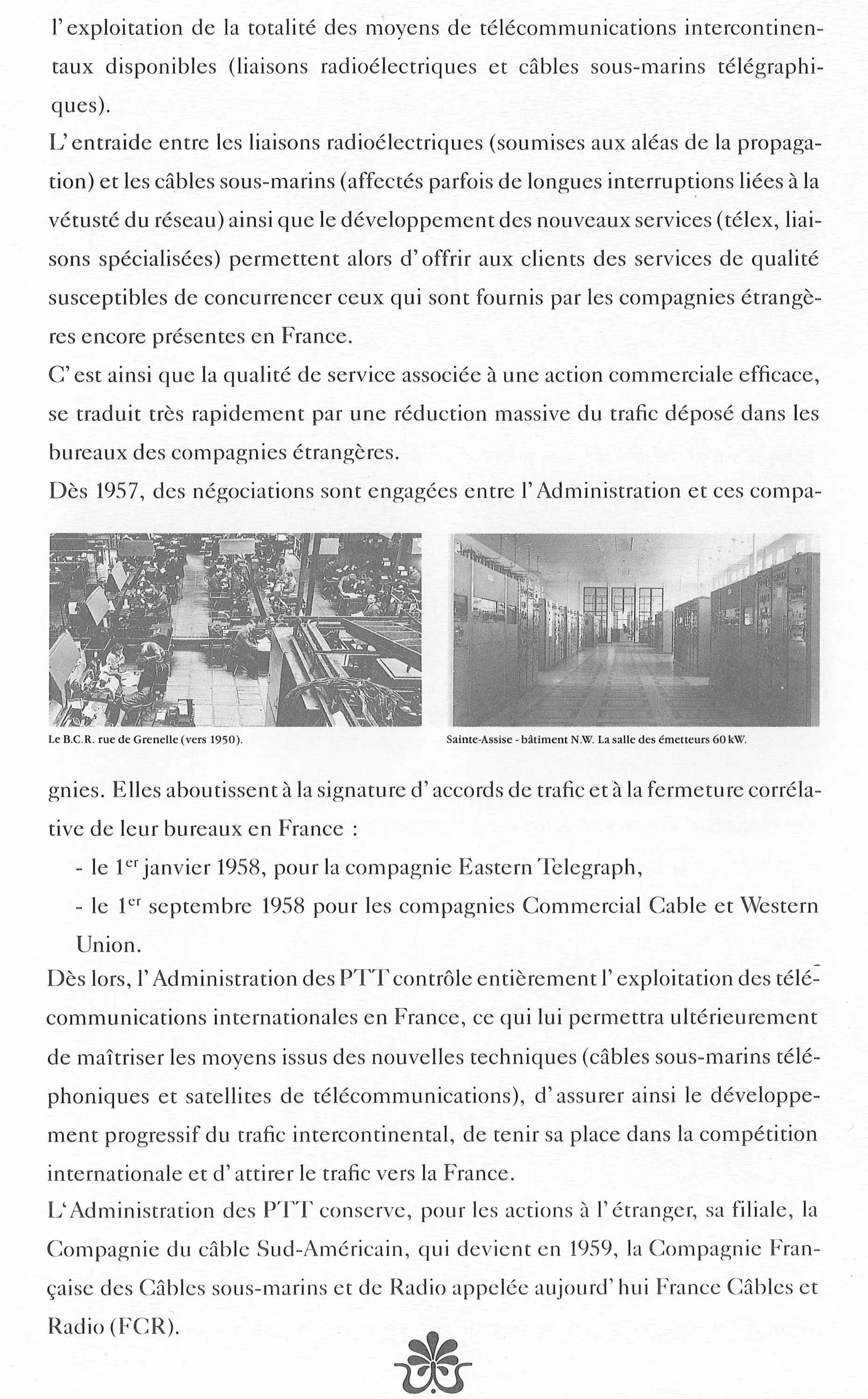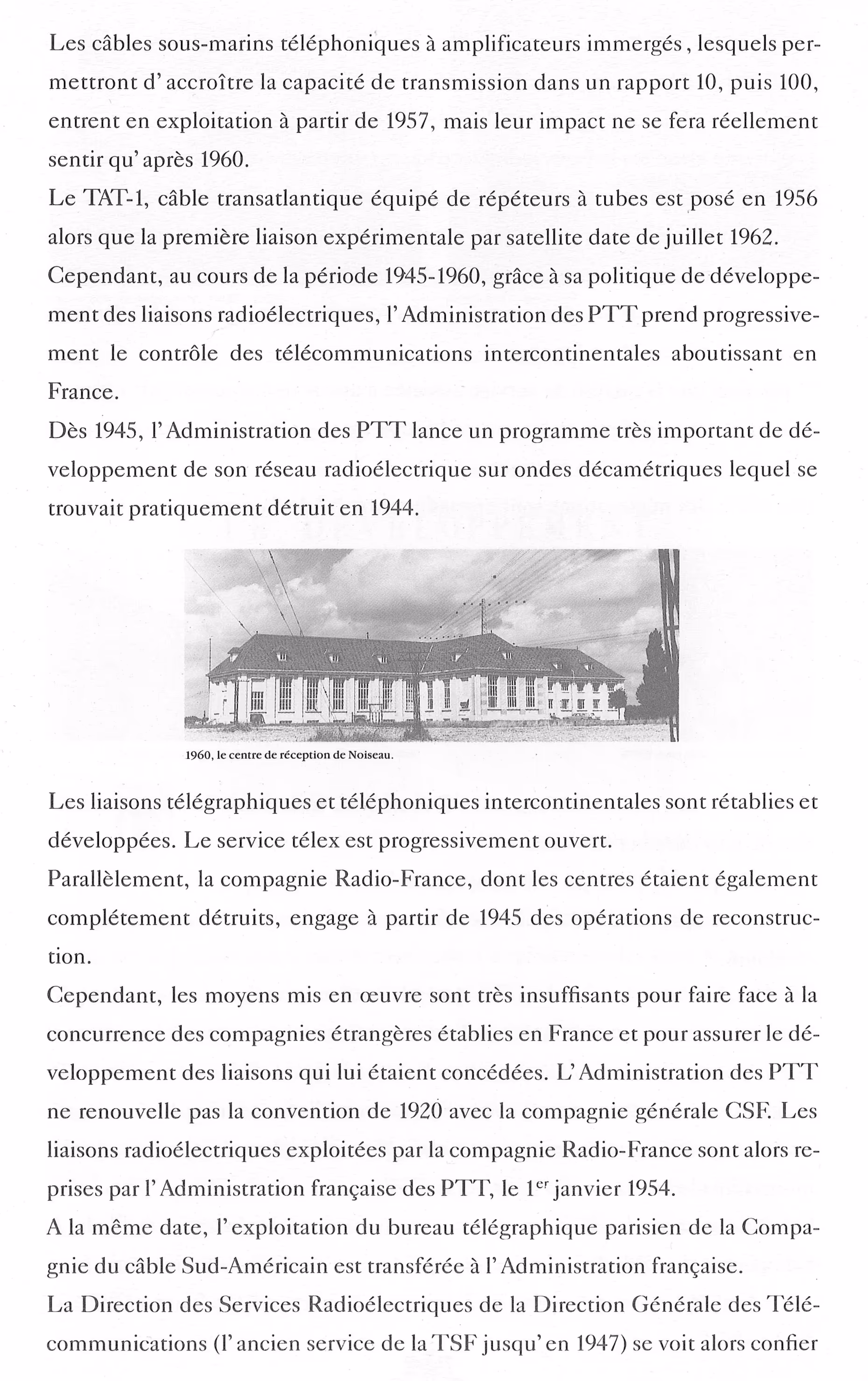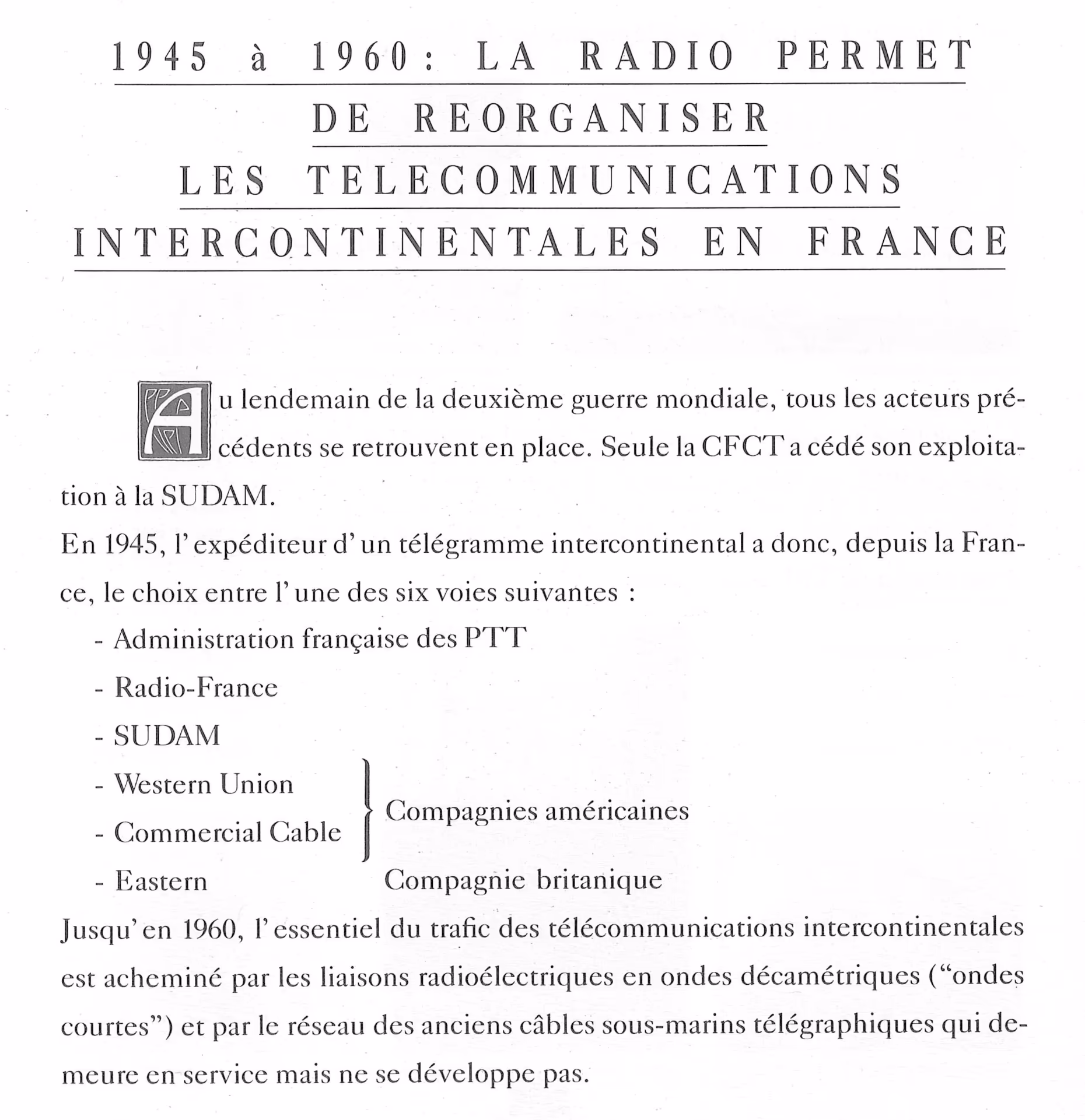 Extrait d'une partie du document, sur la période 1945-1960, où les échanges internationaux sont réalisés en onde courte, avant l'arrivée des câbles sous-marins téléphoniques à amplificateurs immergés à partir de 1957. Le satellite sera lui expérimenté à partir de 1962 :