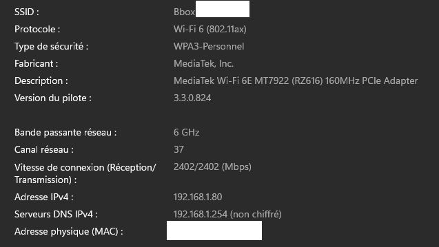 J'ai des problèmes de connexion WIFI lorsque je suis connecté avec mon ordinateur portable avec Windows 11 en WIFI 6E / WPA3. Régulièrement en allumant le PC, la connexion au WIFI ne se fait pas et la demande de connexion manuelle ne fonctionne pas alors que tout semble bon (affichage de la clé -> clé OK). Pour corriger cette erreur il faut soit que je redémarre la box, soit que j'oublie le réseau et que je me reconnecte en re rentrant le mdp.