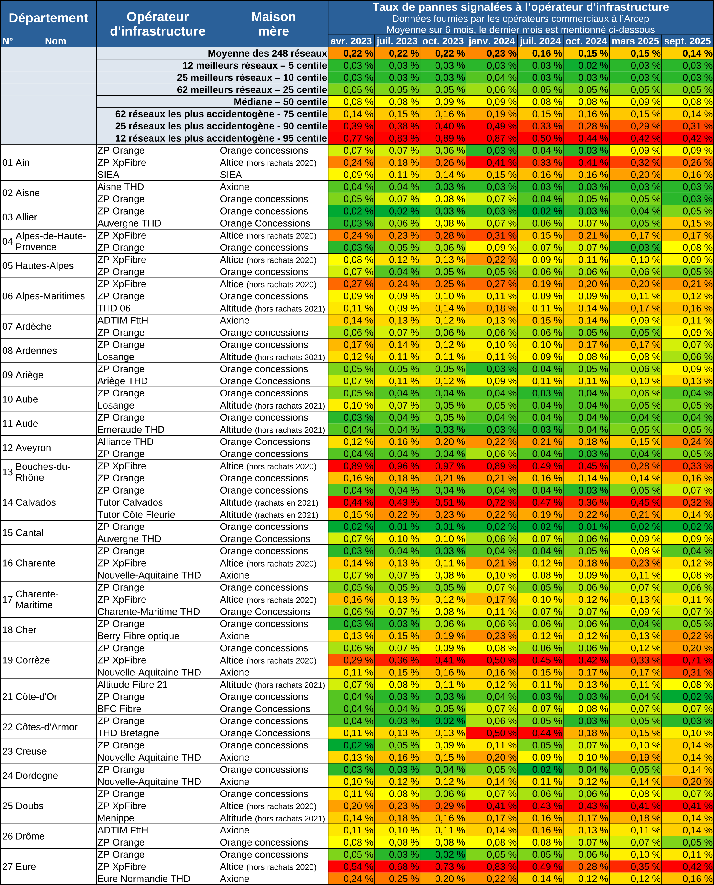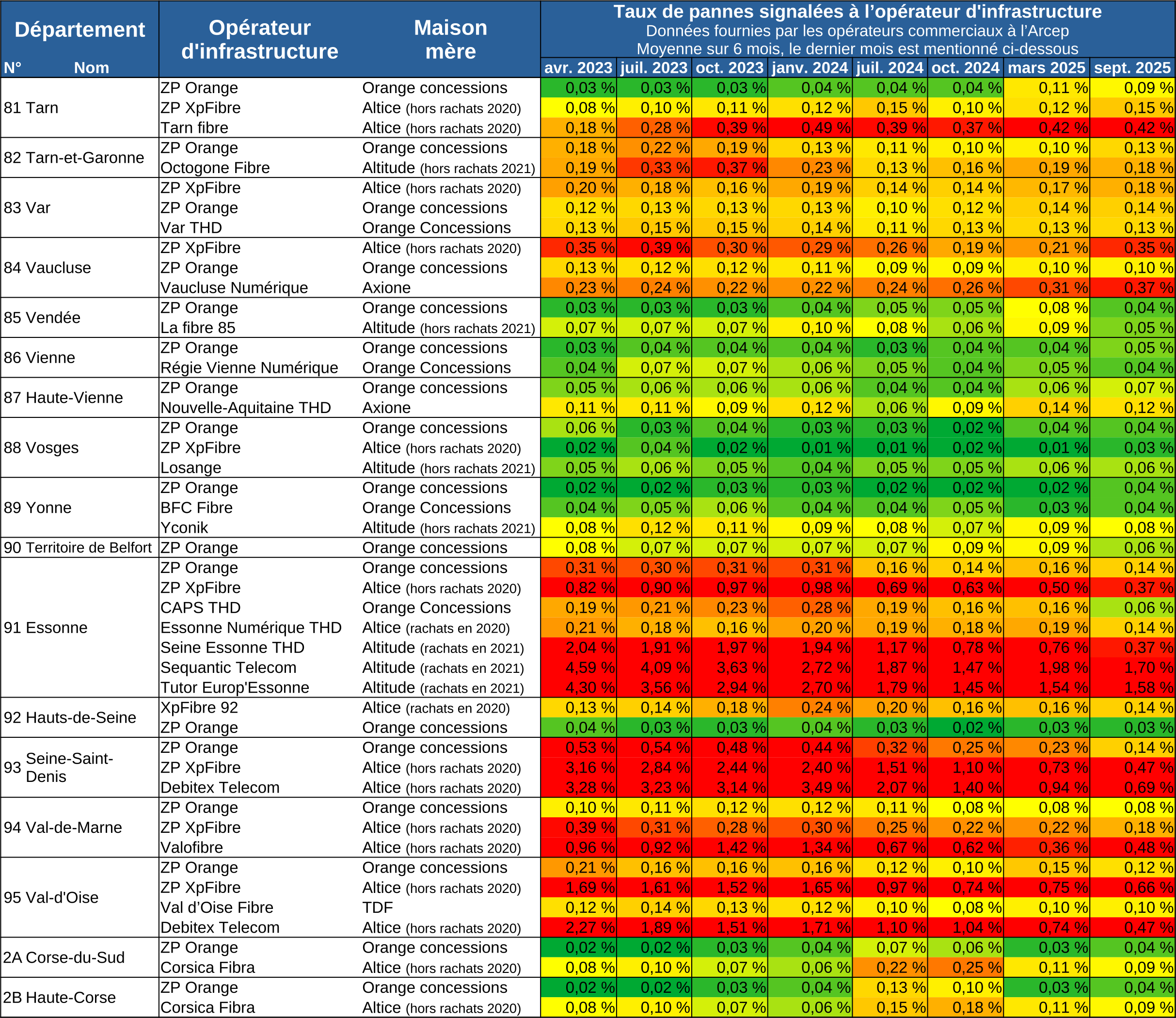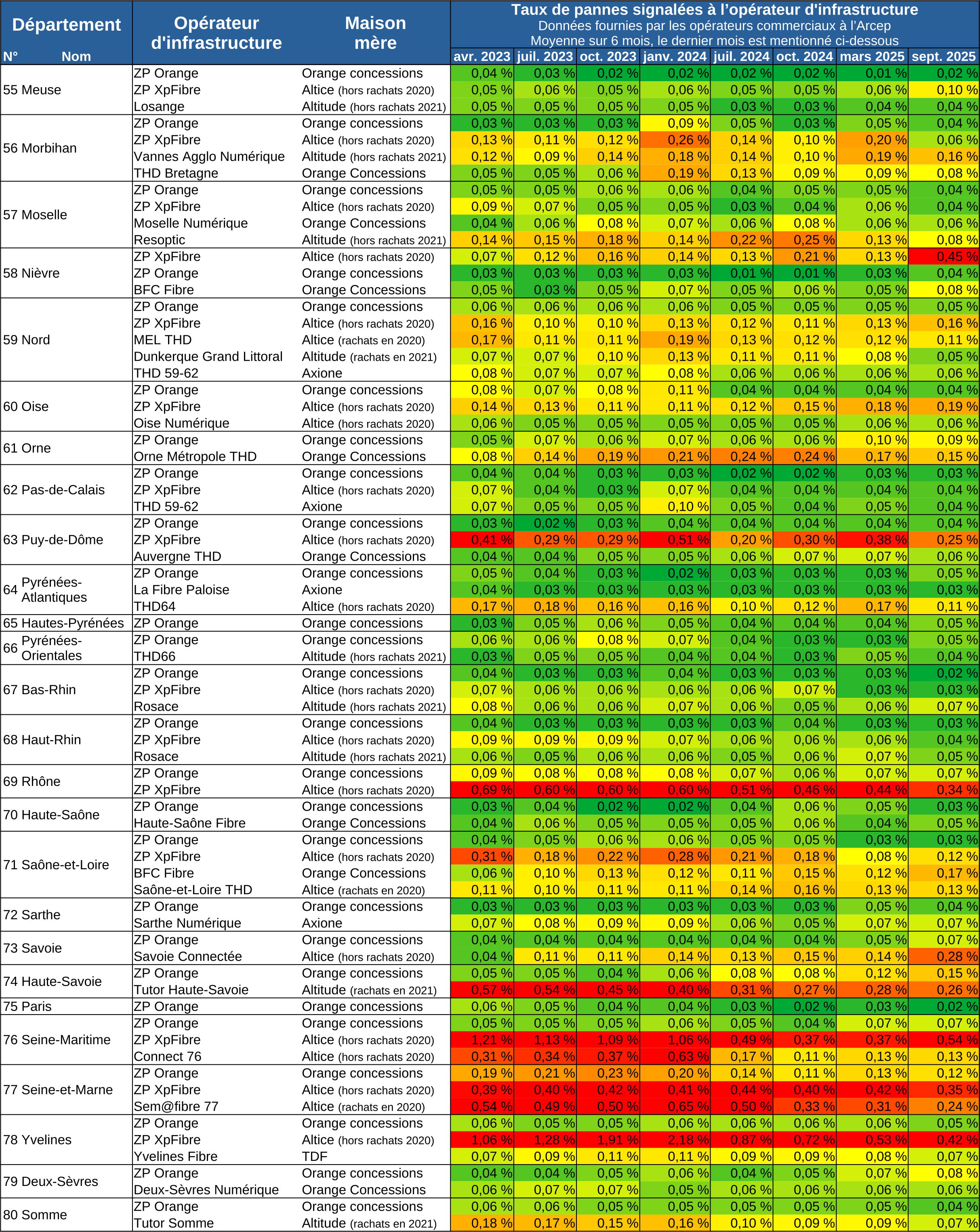 Si les tableaux sont issus de données en open data que j'ai retraité pour un affichage par département et une mise en couleur des pourcentages, tous les graphiques sont issues de l'observatoire Arcep de la qualité des réseaux en fibre optique - les chiffres jusqu'à octobre 2024(cliquez sur la miniature ci-dessous - le document est au format PDF)