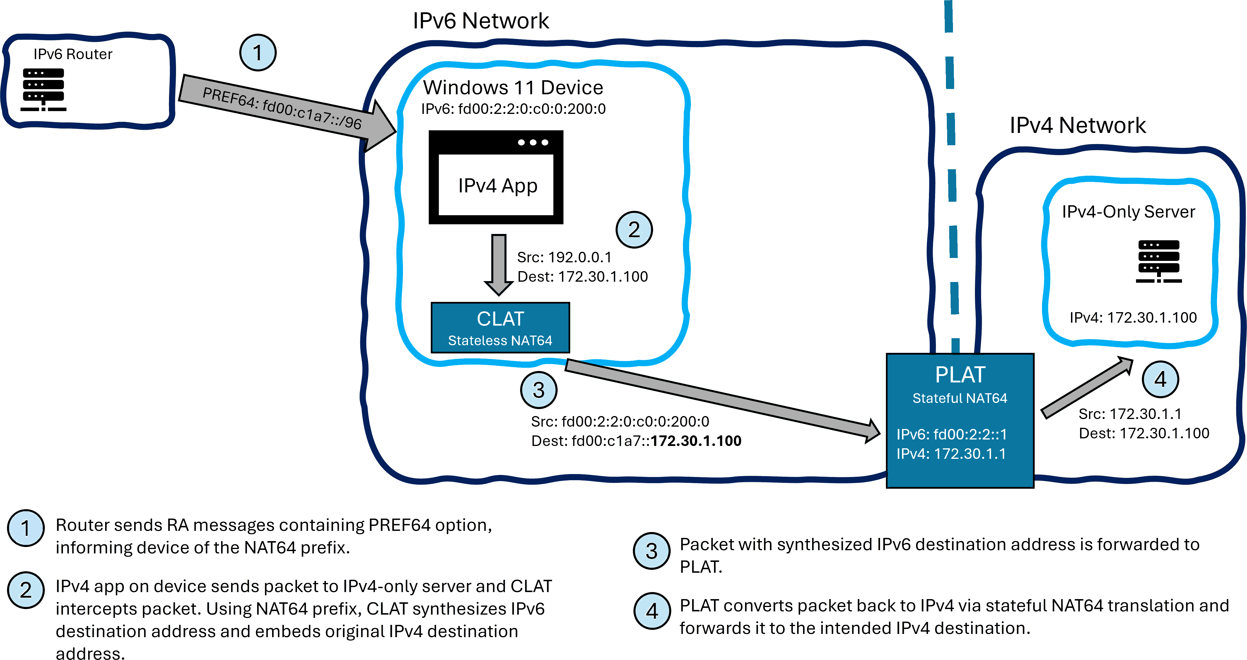 Un seul préfixe NAT64 est utilisé, aussi bien pour le DNS64 que pour le 464XLAT. Toutefois l’opérateur alloue un /64 d’adresses IPv6 au mobile. De nombreux mobiles Android utilisent une IPv6 source, différente de l’IPv6 source utilisée par le CLAT, pour les flux qui partent directement sur Internet.