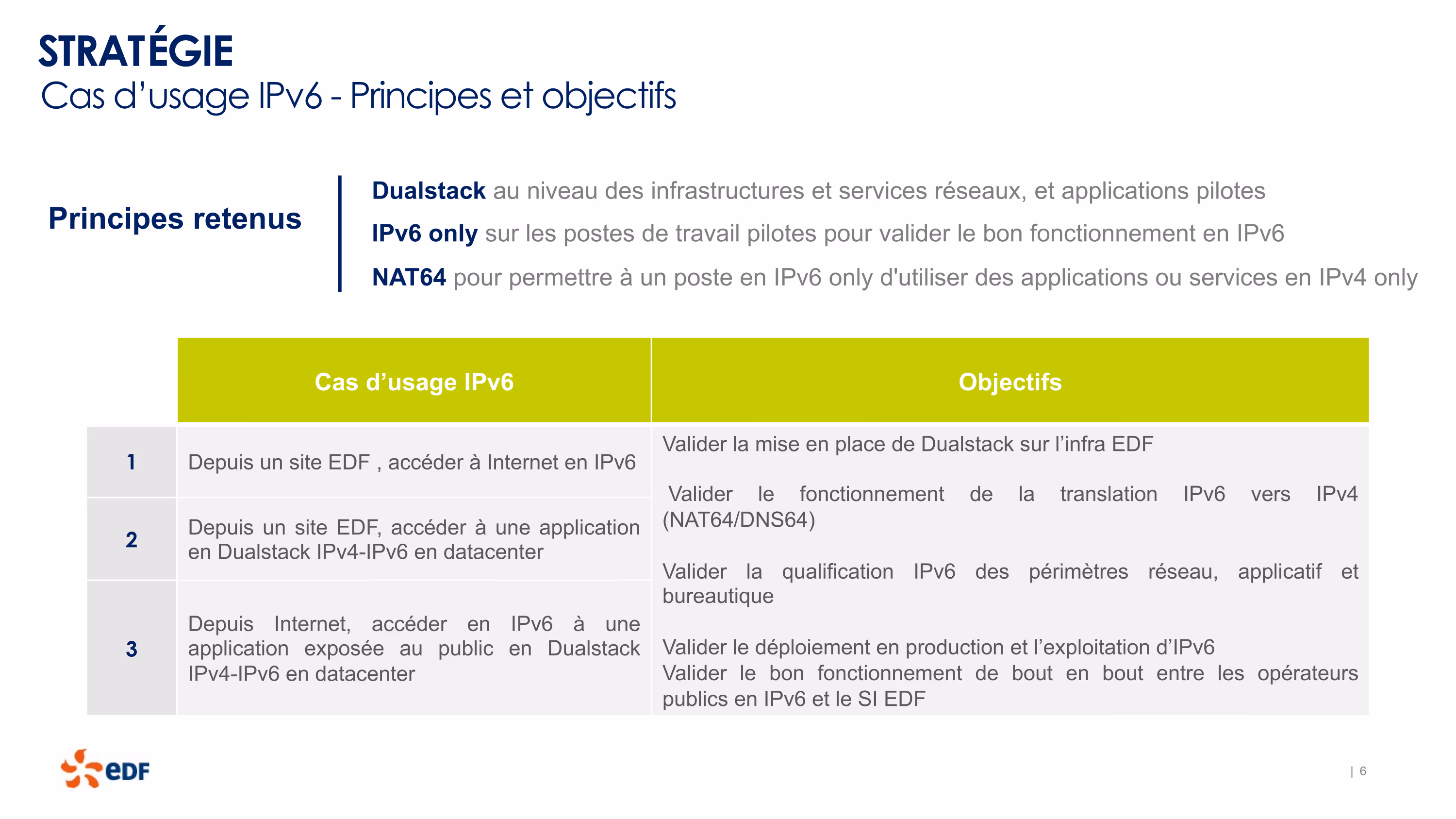 - pour que les entreprises migrent vers v6 en masse, il va falloir attendre qu'un bon nombre de DSI parte à la retraite (résistance au changement, quel qu'il soit, rien à voir avec IPv6 spécifiquement)... et qu'on réfléchisse sérieusement à former nos jeunes à IPv6, pas à les former à IPv4 puis, à la fin du cours, mettre une slide sur IPv6 qui dit "c'est la même chose avec plus de bits, mais c'est pour le futur dans 20 ans".