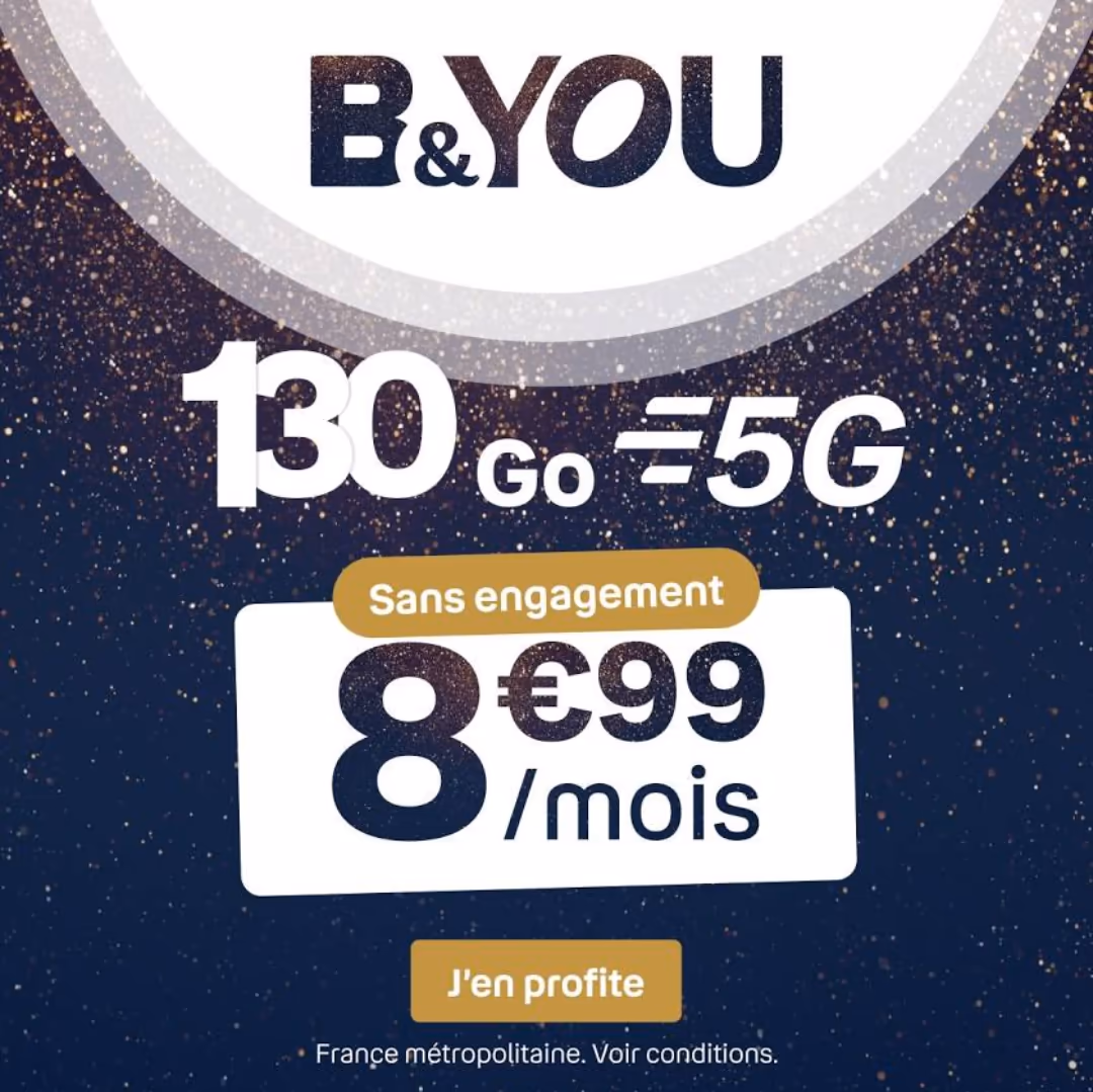 - B&You 130 Go de 5G Bouygues : 8,99 €/mois (B&You offre 30 Go de plus en France, 25 Go de plus eu Europe, la 5G en plus pour 1€/mois moins cher !)