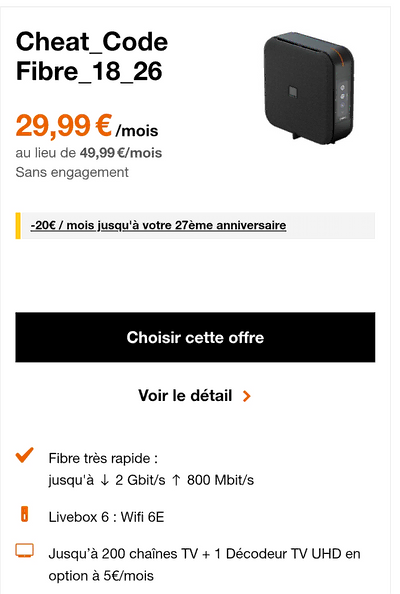 La fibre avec la Livebox 6 passe à 9,99 €/mois. jusqu'au 08 avril 2026 inclus