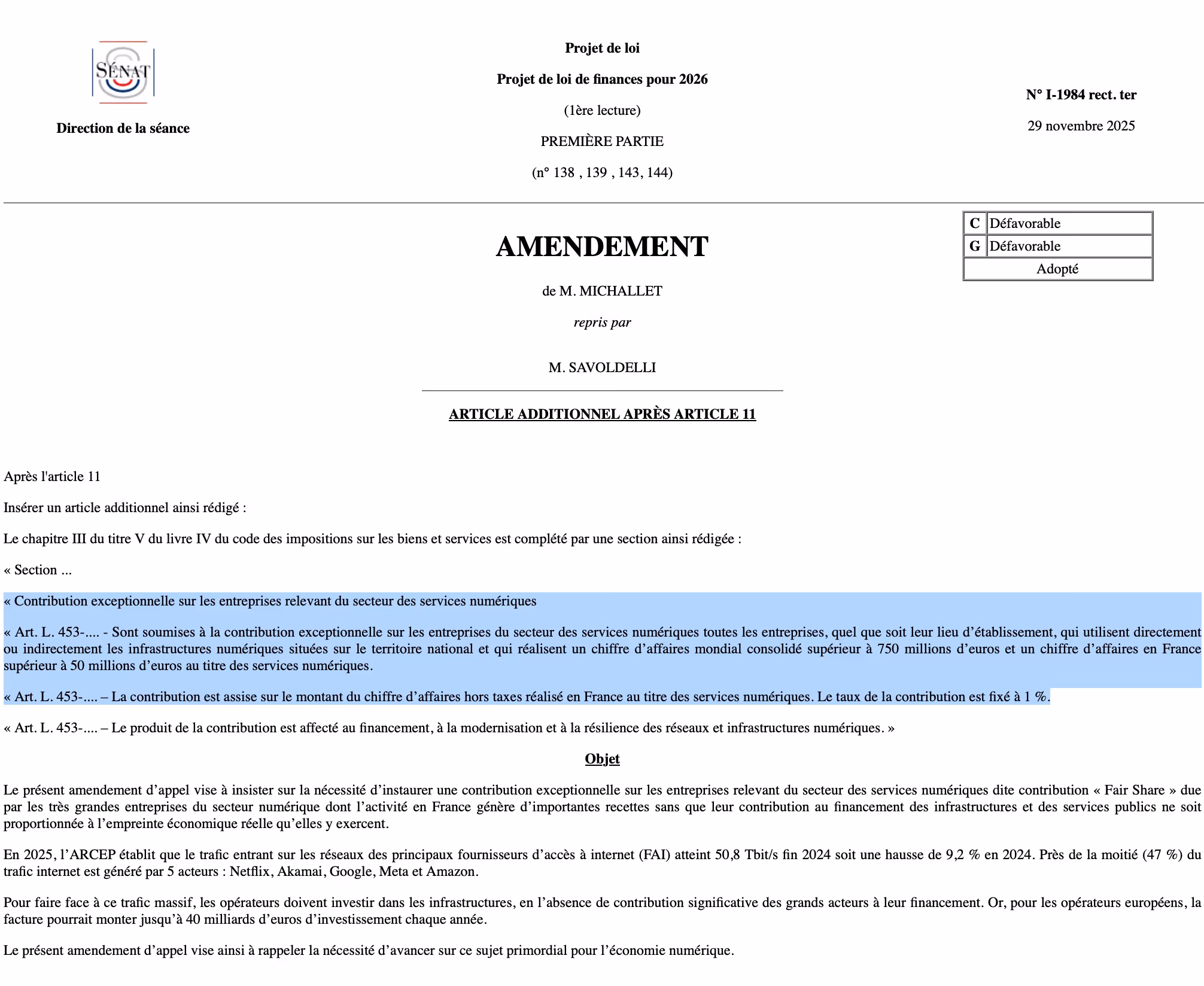 En revanche je me demande comment le produit peut être "affecté au financement, à la modernisation et à la résilience des réseaux et infrastructures numériques" sachant que comme le mentionne l'objet de l'amendement ce sont les opérateurs privés qui investissent.
