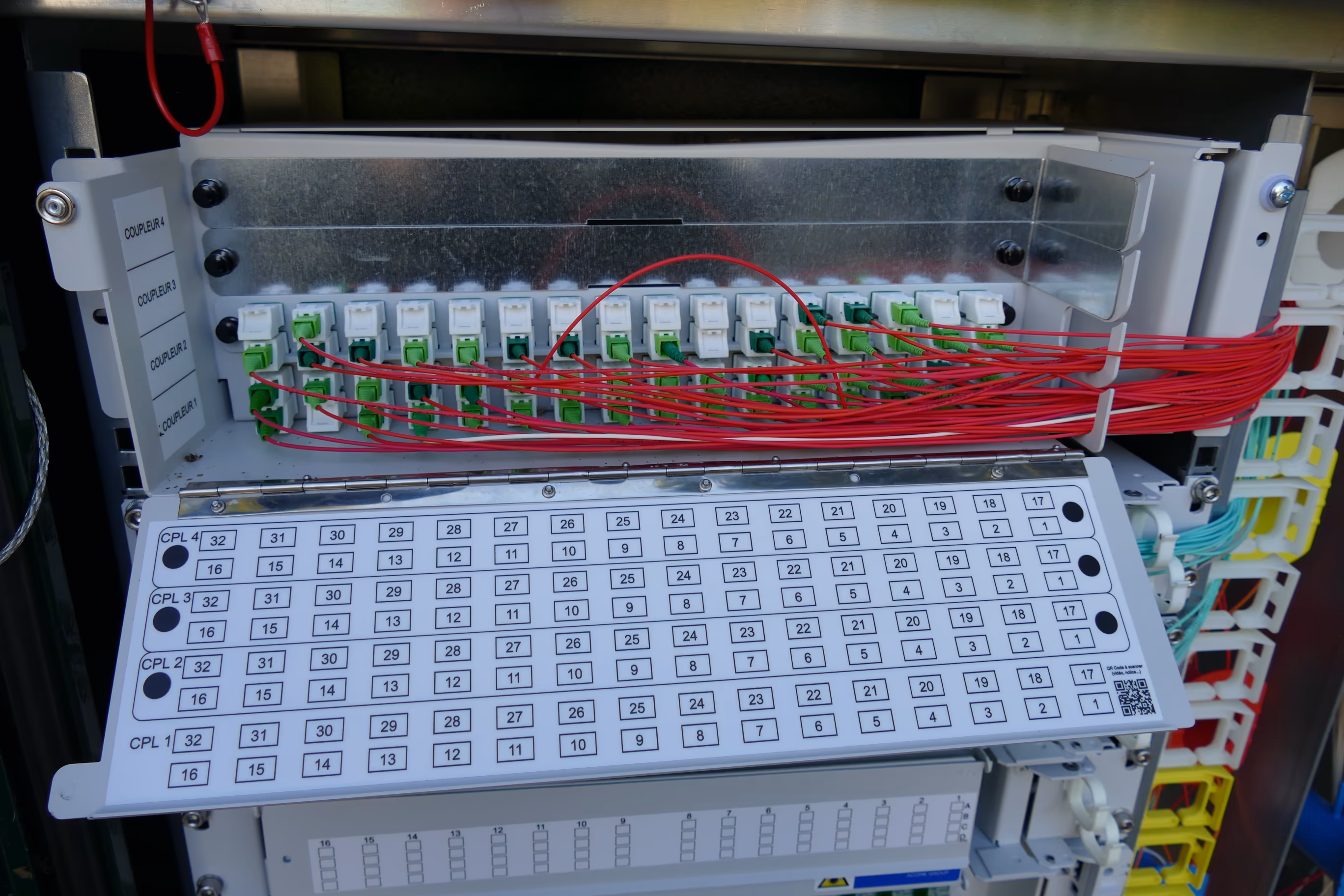 À gauche, on retrouve les coupleurs optiques des opérateurs : Il y a un ou plusieurs blocs distincts pour chaque opérateur et c’est la que la fibre qui vient du NRO est divisée en 32 ou 64 clients. Orange et Free mettent 32 clients par fibre, tandis que SFR, Bouygues et XpFibre en mettent 64 clients. Au NRO, Orange assemblera 2 fibres pour obtenir les 64 clients par arbre Gpon / XGS Pon.