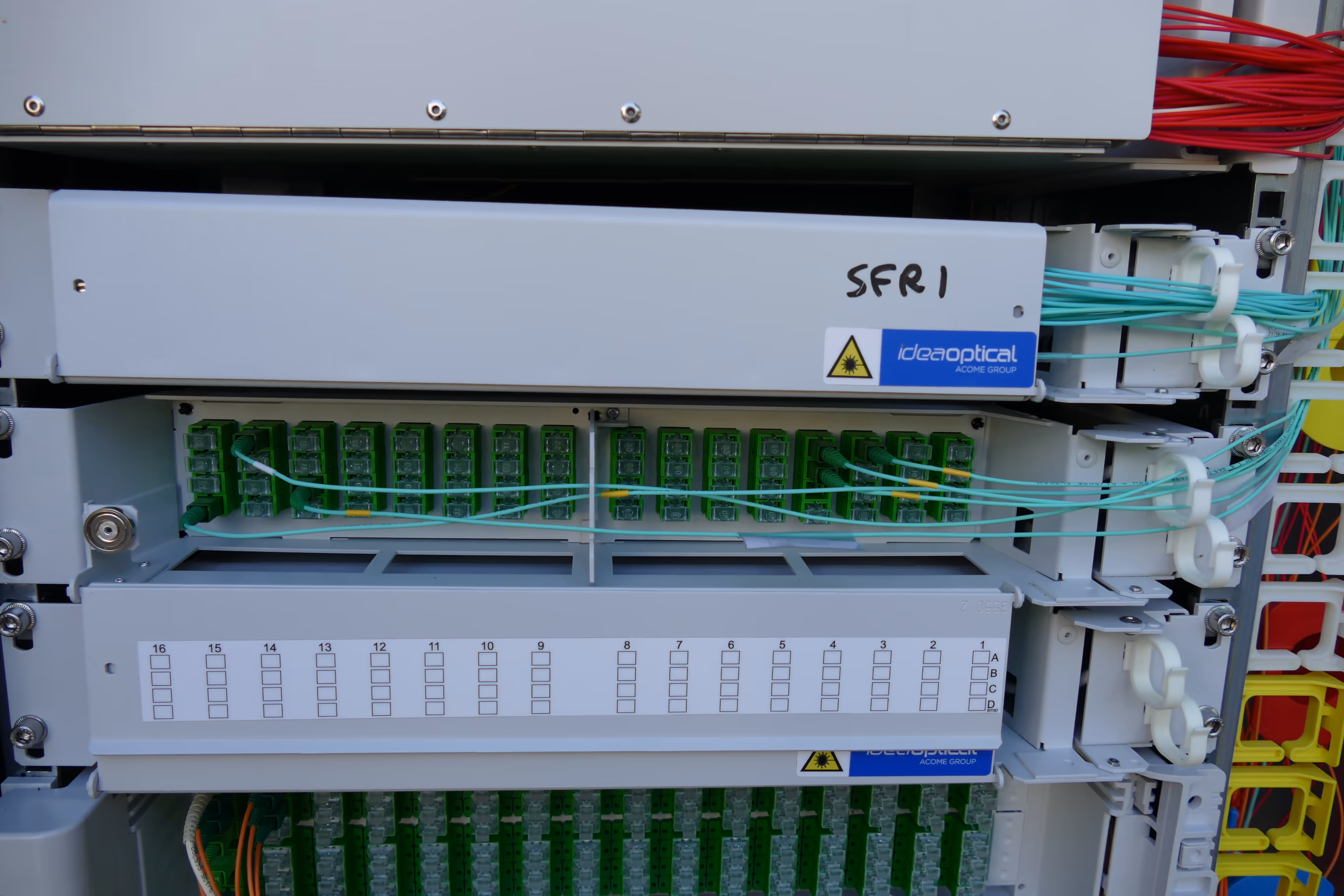 Deux types de blocs sont tout en bas pour les fibres provenant du NRO : Le 4 tiroirs Ideaoptical sont les fibres de XpFibre qui vont vers le NRO situé 10 mettre plus loin. Ces fibres sont utilisées par tous les opérateurs sauf Orange.