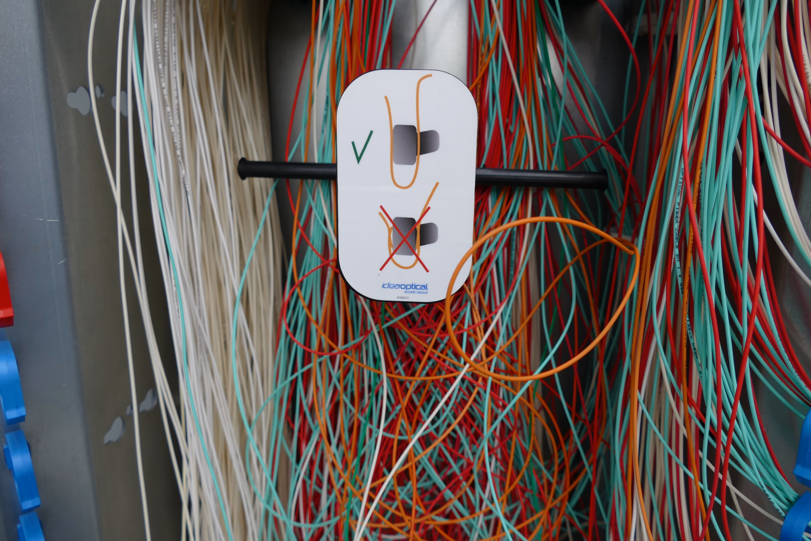 Ici, contrairement au point de mutualisation précédent, on est sur une armoire Idea Optical, qui est un peu plus haute (34 U) que celle de Grolleau (28 U). Les cordons optiques ont normalement tous une longueur de 3,50 mètres pour les armoires de 34U, comme pour les armoires de 28U.