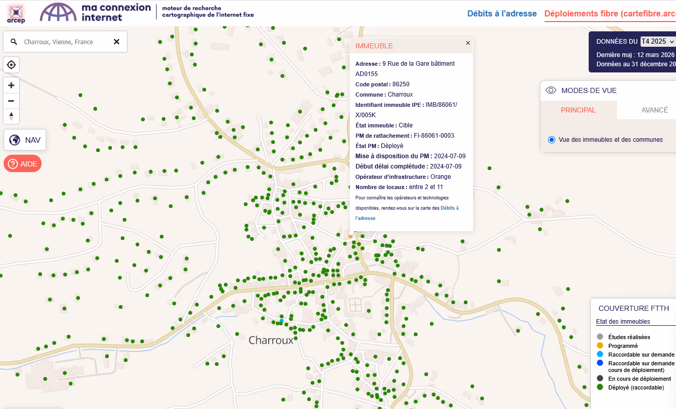 Je réside en zone rurale sur la commune de Charroux (86) et mon logement est en statut "Raccordable à la demande" selon l'ARCEP depuis au moins décembre 2025. Orange est l'opérateur d'infrastructure unique sur ma zone.