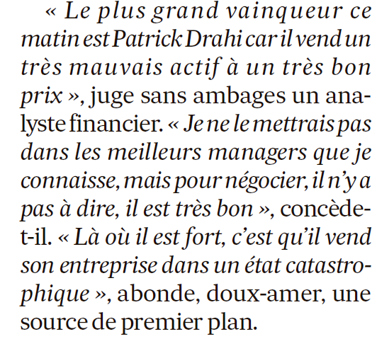 En fait, ils vont osciller entre "c'est payé trop cher", et grosse déception "pas d'amélioration des marges si la consolidation ne se fait pas".