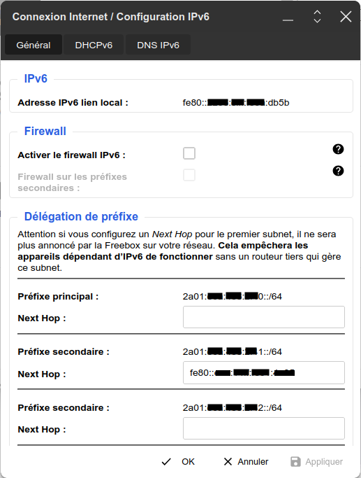 DHCPv6 désactivé, DNS IPv6 désactivé, Firewall IPv6 désactivé; j’ai configuré uniquement le premier préfixe secondaire disponible (2a01:****:****:***1::/64) avec l’adresse link-local (fe80::...) du WAN primaire du routeur (eth4).