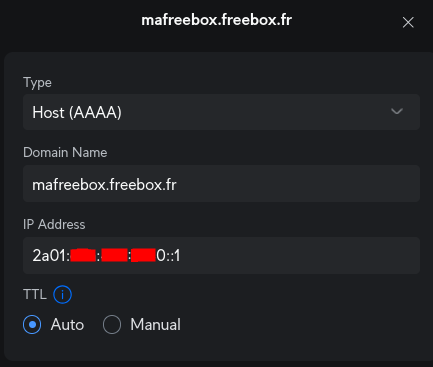 • IP Address: 2a01:***:***:***0::1 (ici c’est l’IPv6 de la Freebox visible dans "État de la Freebox" et qui correspond au Préfixe principal + :1)