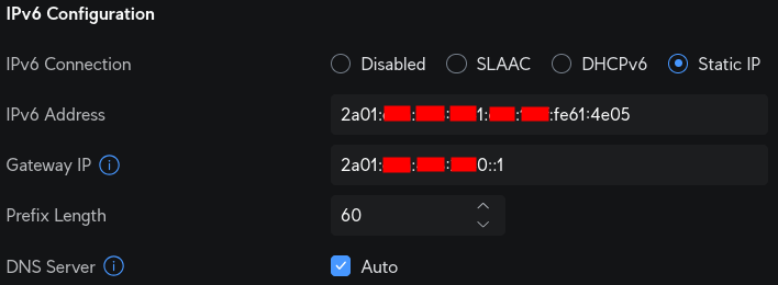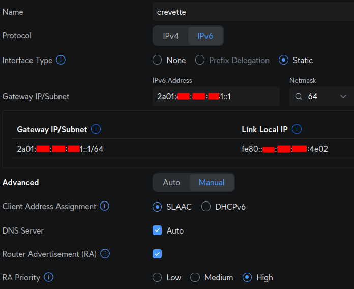 • IPv6 Address: 2a01:***:***:***1:***:***:***:4e05 (note: j’ai "construit" cette IP à partir du préfixe secondaire de la Freebox + les 4 derniers champs de l’adresse fe80:... de mon WAN. Je me suis inspiré de l’adresse que la Freebox avait attribué à l’UCG lors d’une première tentative infructueuse avec SLAAC mais en l’adaptant).