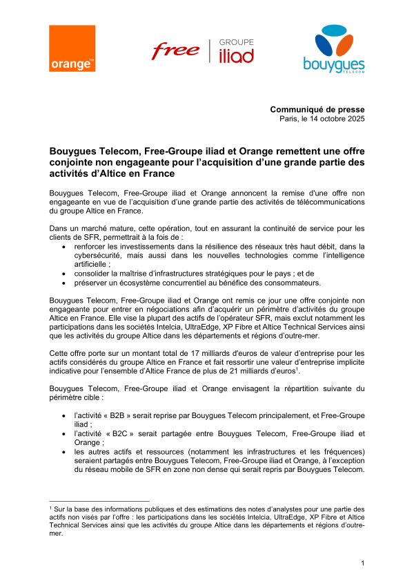 Bouygues Telecom, Free-Groupe iliad et Orange ont remis ce jour une offre conjointe non engageante pour entrer en négociations afin d'acquérir un périmètre d'activités du groupe Altice en France. Elle vise la plupart des actifs de l'opérateur SFR, mais exclut notamment les participations dans les sociétés Intelcia, UltraEdge, XP Fibre et Altice Technical Services ainsi que les activités du groupe Altice dans les départements et régions d'outre-mer.