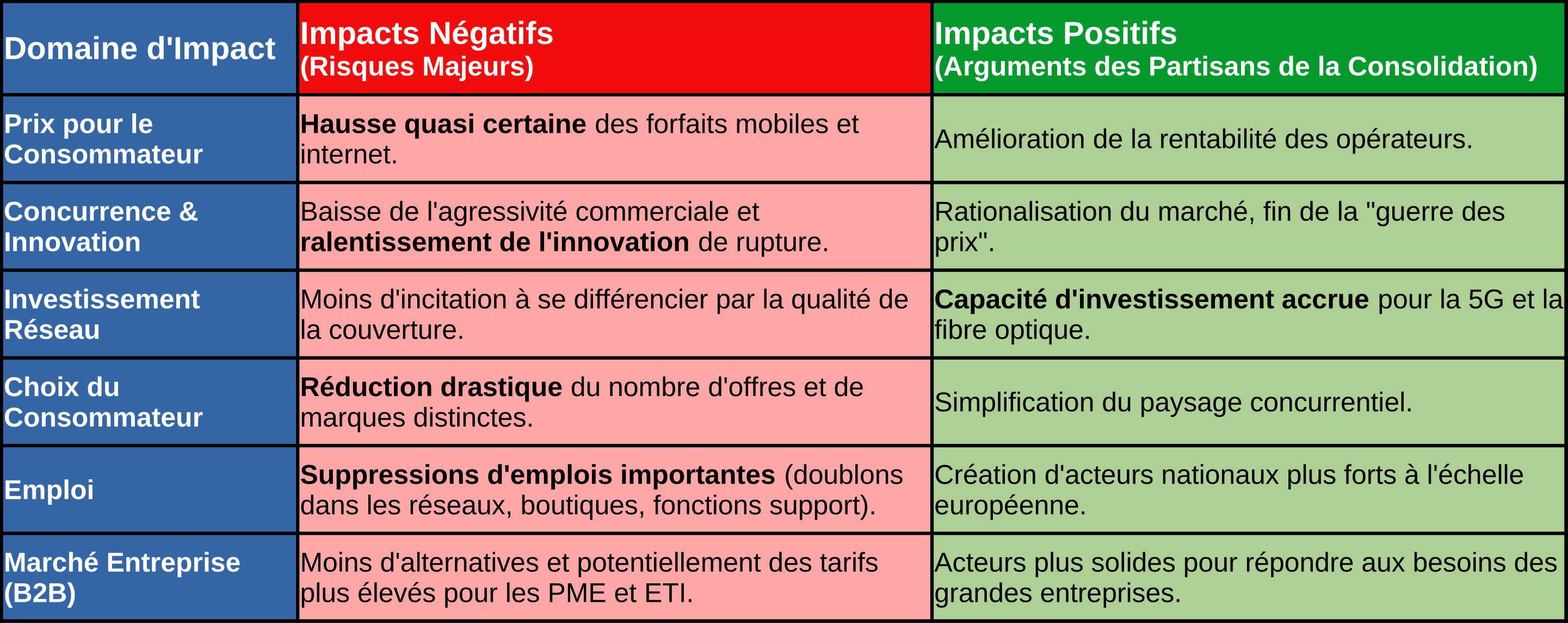 En conclusion, si ce scénario est une tentation permanente pour les opérateurs en quête de rentabilité, il représente un risque majeur pour le consommateur français. L'expérience de la dernière décennie a prouvé que l'existence de quatre acteurs nationaux a été le principal moteur de la baisse des prix et de l'innovation. Un retour à trois acteurs serait donc perçu comme une régression concurrentielle, difficilement acceptable pour les régulateurs et les pouvoirs publics sans garanties extrêmement fortes.