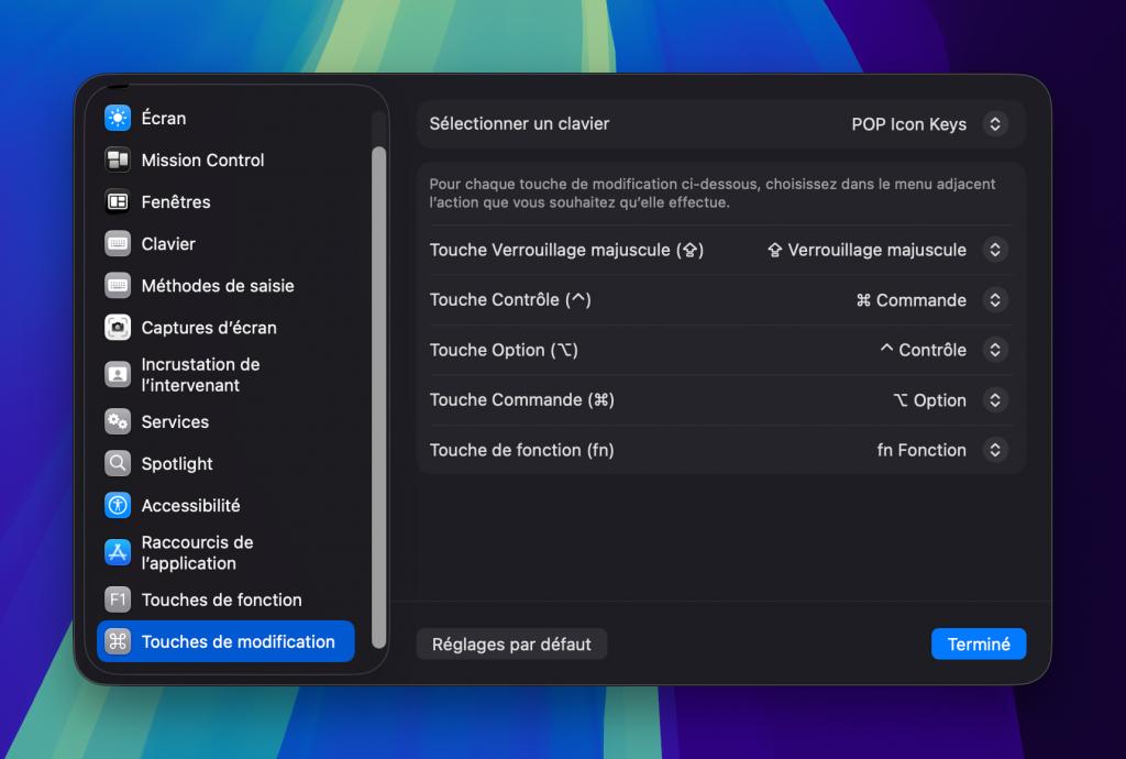Après avoir installé son clavier, il faut ouvrir les Réglages Système > Clavier > Raccourcis clavier > Touche de modification.