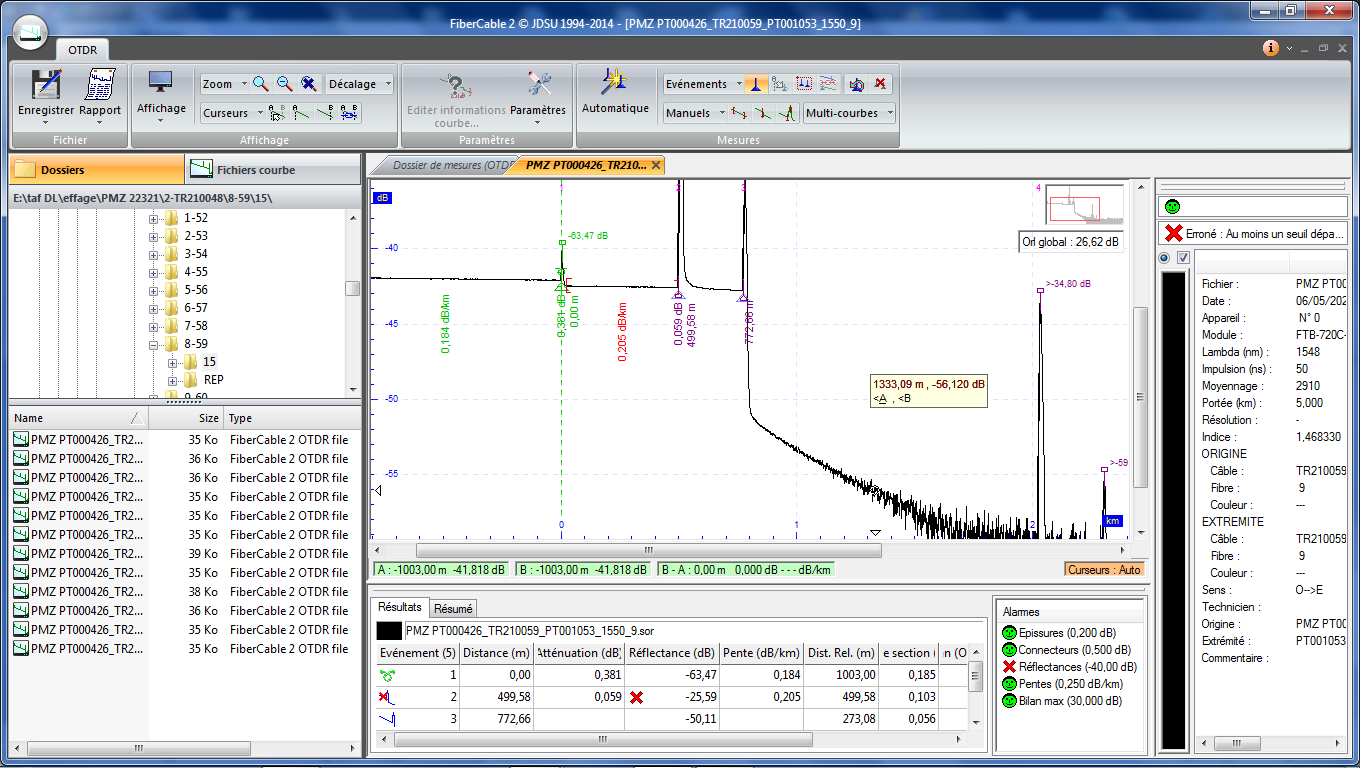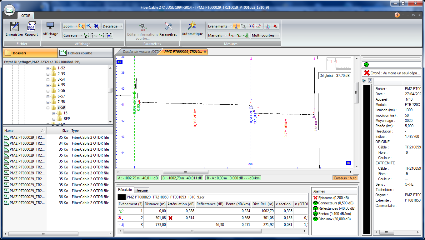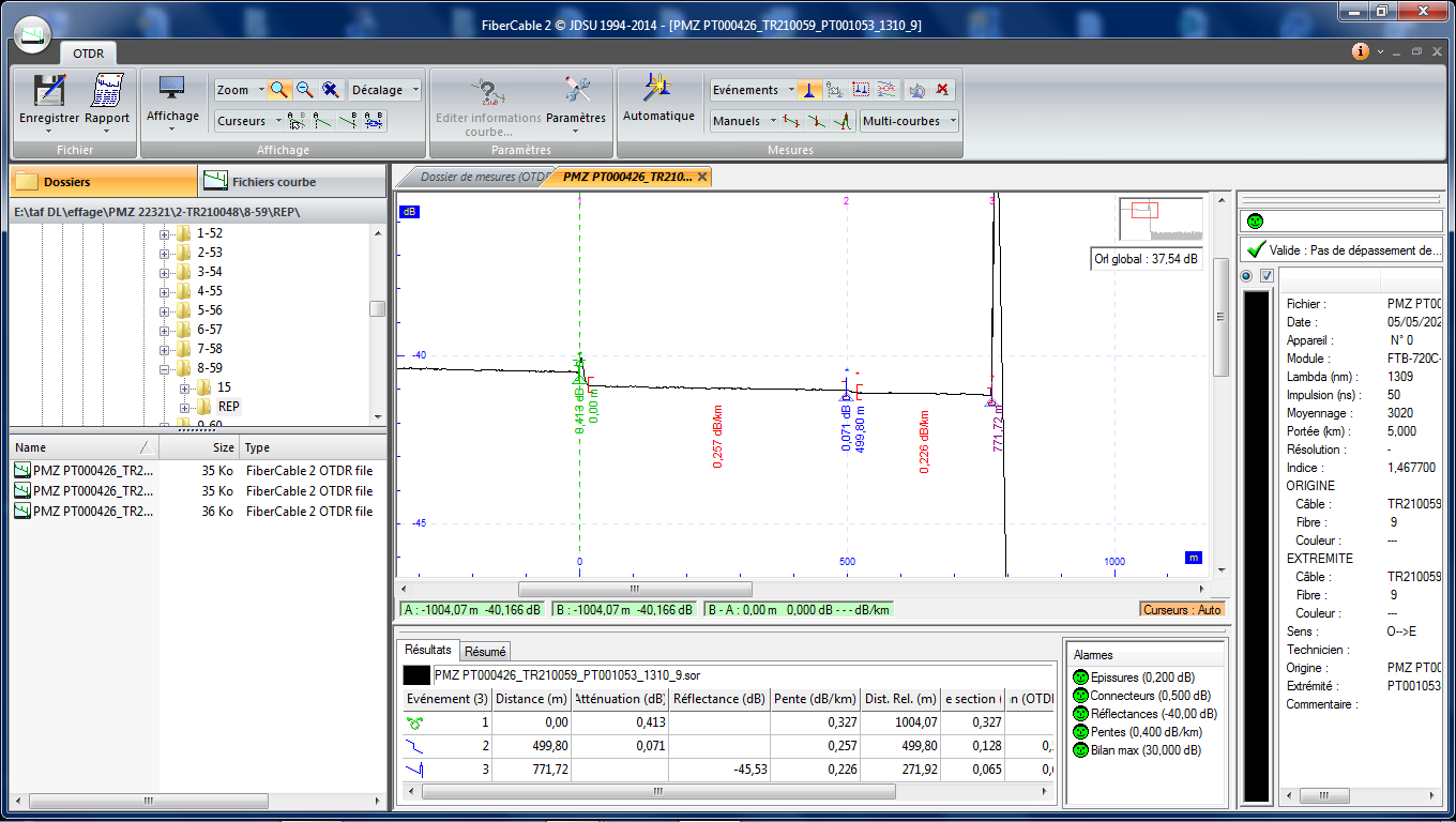 Je détecte une mauvaise Soudure, Hier nous la reprenons je passe de 0.504 dB à 0.071 dB, j'ai pris la mesure avant lovage. 50ns 15sec 1310